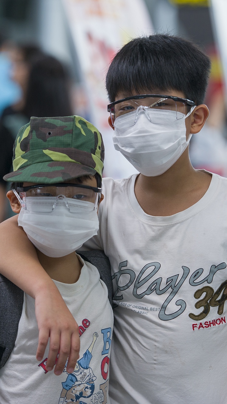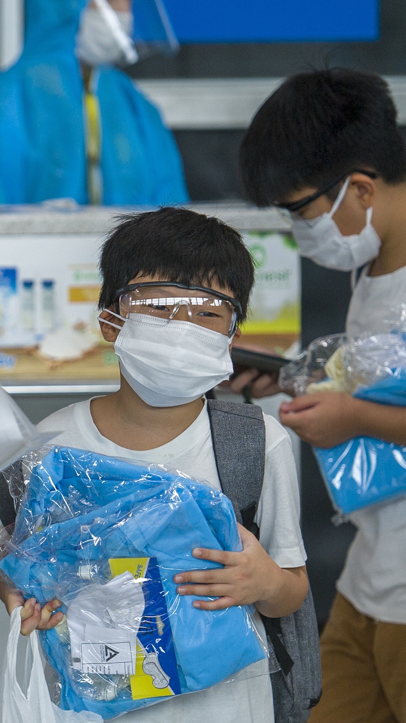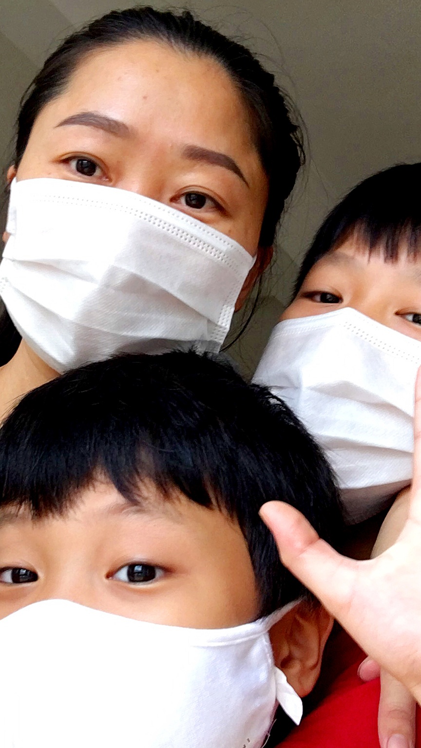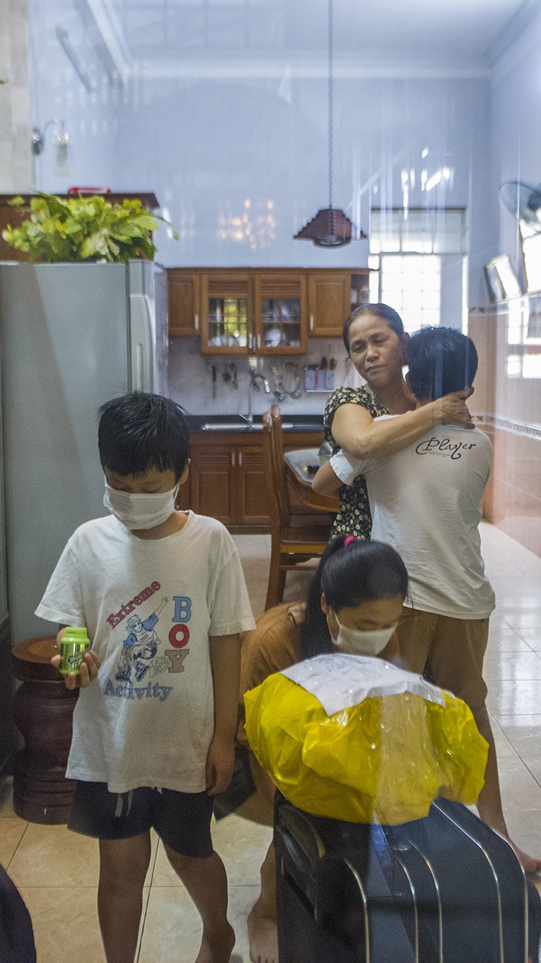 | Các con tôi đứng chờ phía ngoài. Cùng với việc đeo khẩu trang, tôi chuẩn bị cho bọn trẻ kính mắt để hạn chế nguy cơ lây nhiễm. |
