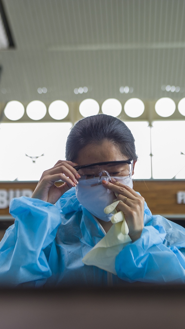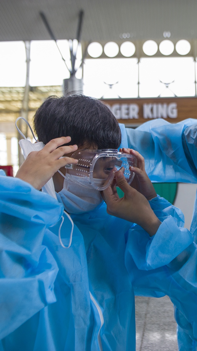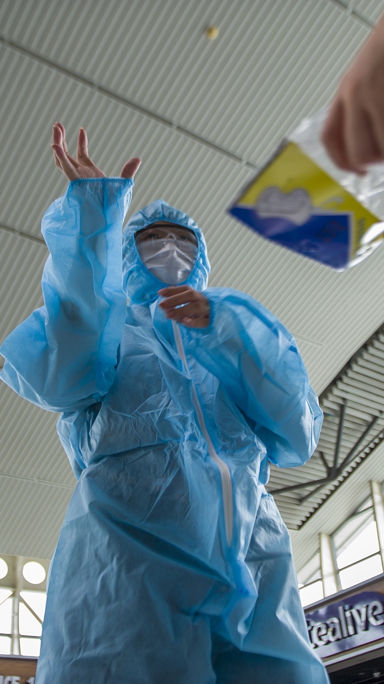 | Xong thủ tục cần thiết, chúng tôi được tình nguyện viên phát tặng 3 bộ quần áo bảo hộ. Mọi người được khuyến cáo nên mặc từ lúc ở sân bay cho đến khi về khu cách ly. |