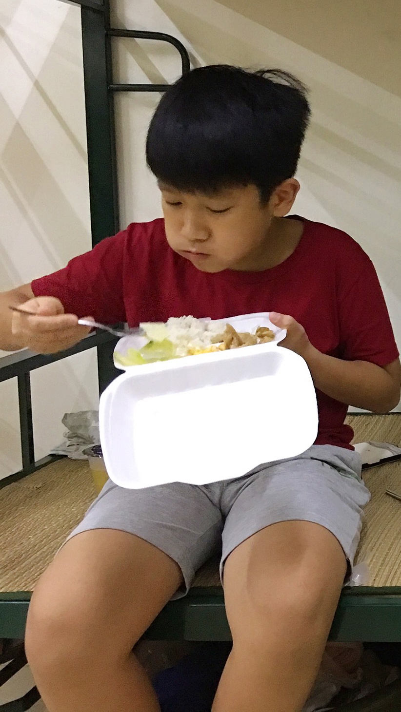 | Tôi và các con được phát cơm hộp, sữa, thức uống và một ít trái cây. Bọn trẻ ăn ngon lành. Chúng nói rằng đồ ăn ở đây ngon hơn cơm mẹ nấu. |