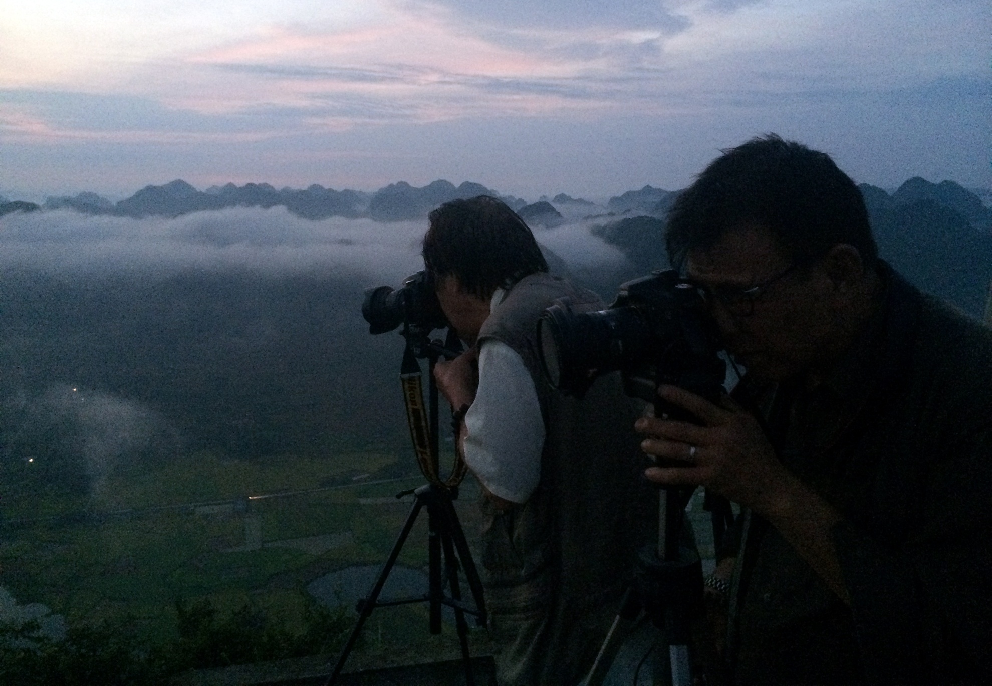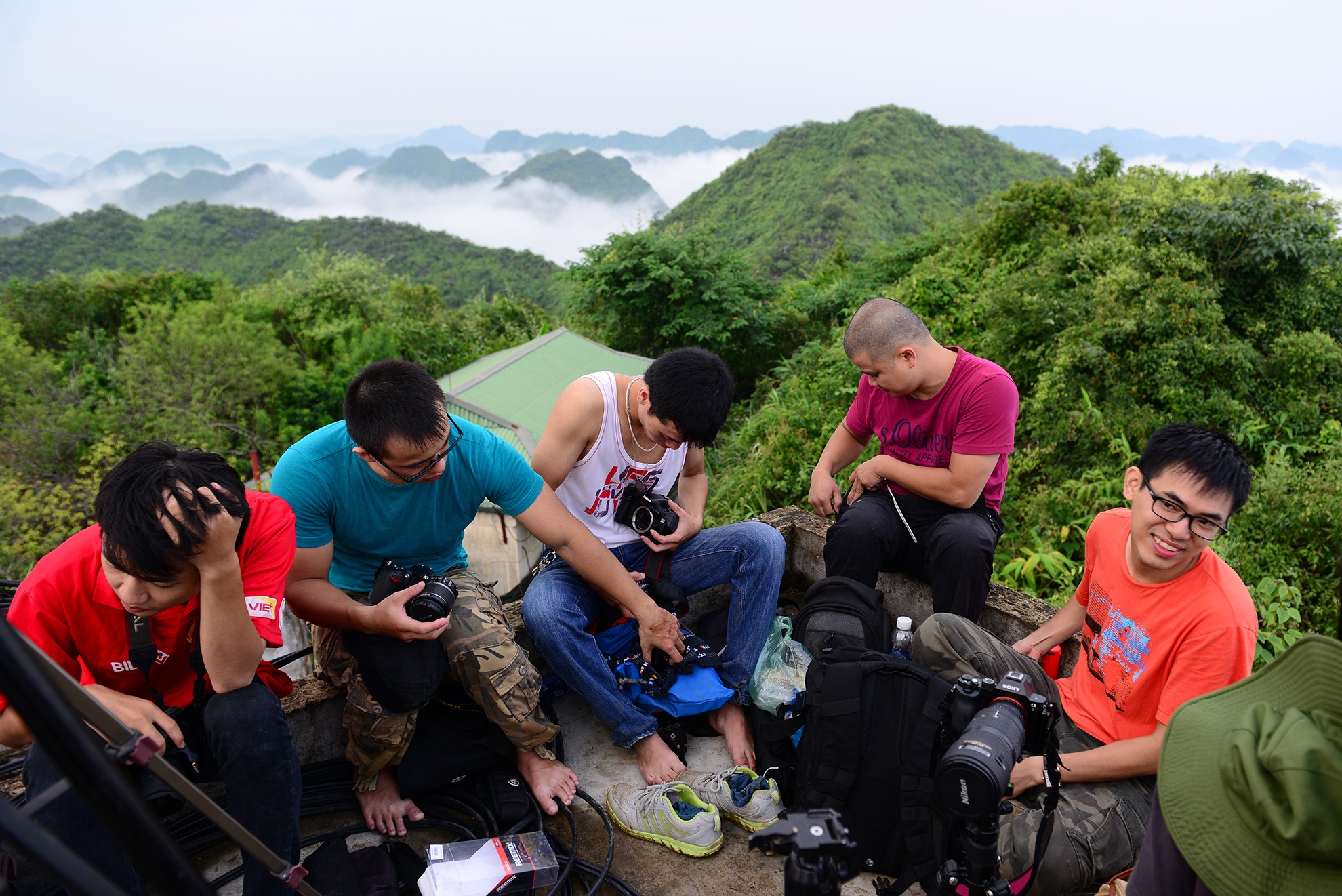| Anh Lê Quang (áo cam, bên phải) cùng bạn chạy xe máy từ Hà Nội đến Bắc Sơn để săn ảnh. Tuy gặp thời tiết không thuận lợi, anh vẫn thấy vui với trải nghiệm đầy thú vị trên đỉnh Nà Lay và sẽ còn trở lại "thung lũng vàng" nhiều lần nữa. |
