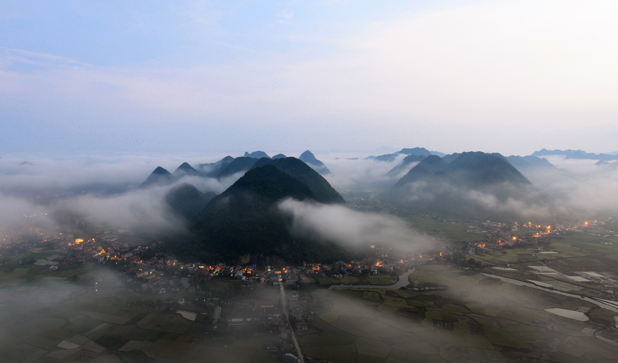 | 5h, bình minh bắt đầu sáng, những ánh đèn dưới thị trấn vẫn còn lấp ló, thung lũng Bắc Sơn dần hiện lên mờ ảo trong những làn mây trắng bồng bềnh. |