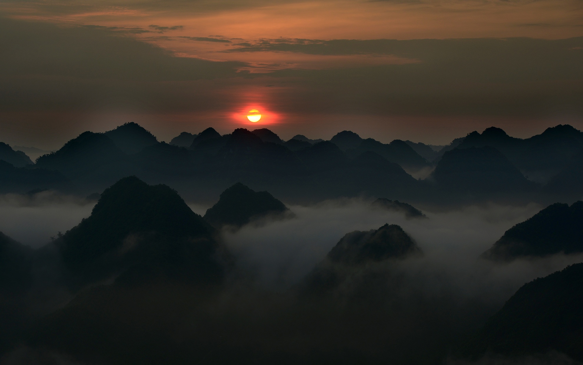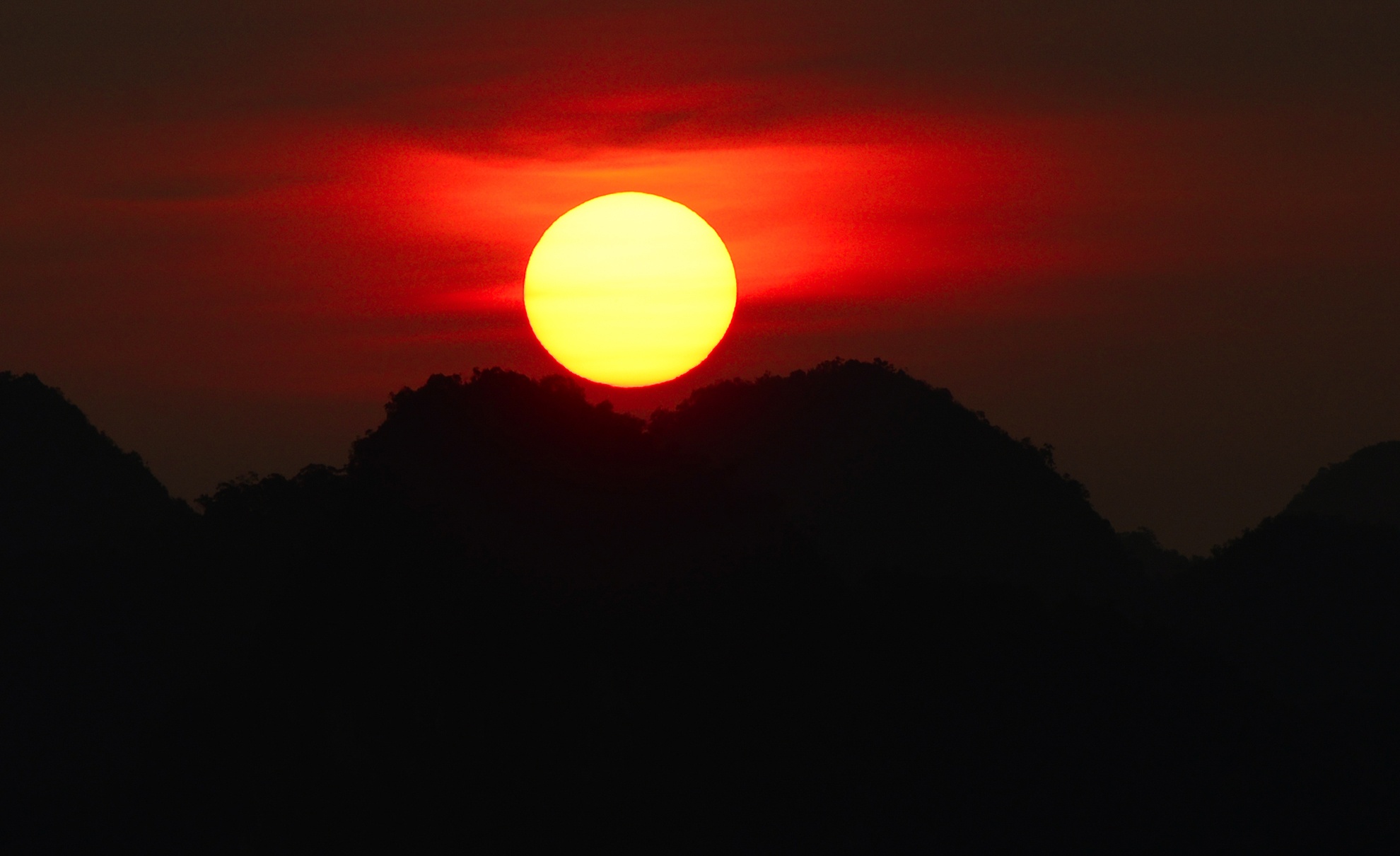 | 6h, mặt trời bắt đầu ló phía cuối những dãy núi trùng điệp ở phía Đông. Cảnh tượng này chỉ diễn ra trong khoảng 3-5 phút là kết thúc. |