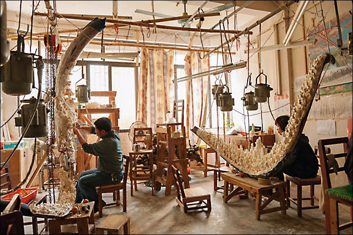 Các thợ thủ công mỹ nghệ chế tác ngà voi và biến nó trở thành đồ trang trí đắt giá. Ngà voi thành phẩm thường được giới nhà giàu Trung Quốc lùng mua. Ảnh: National Geographic.