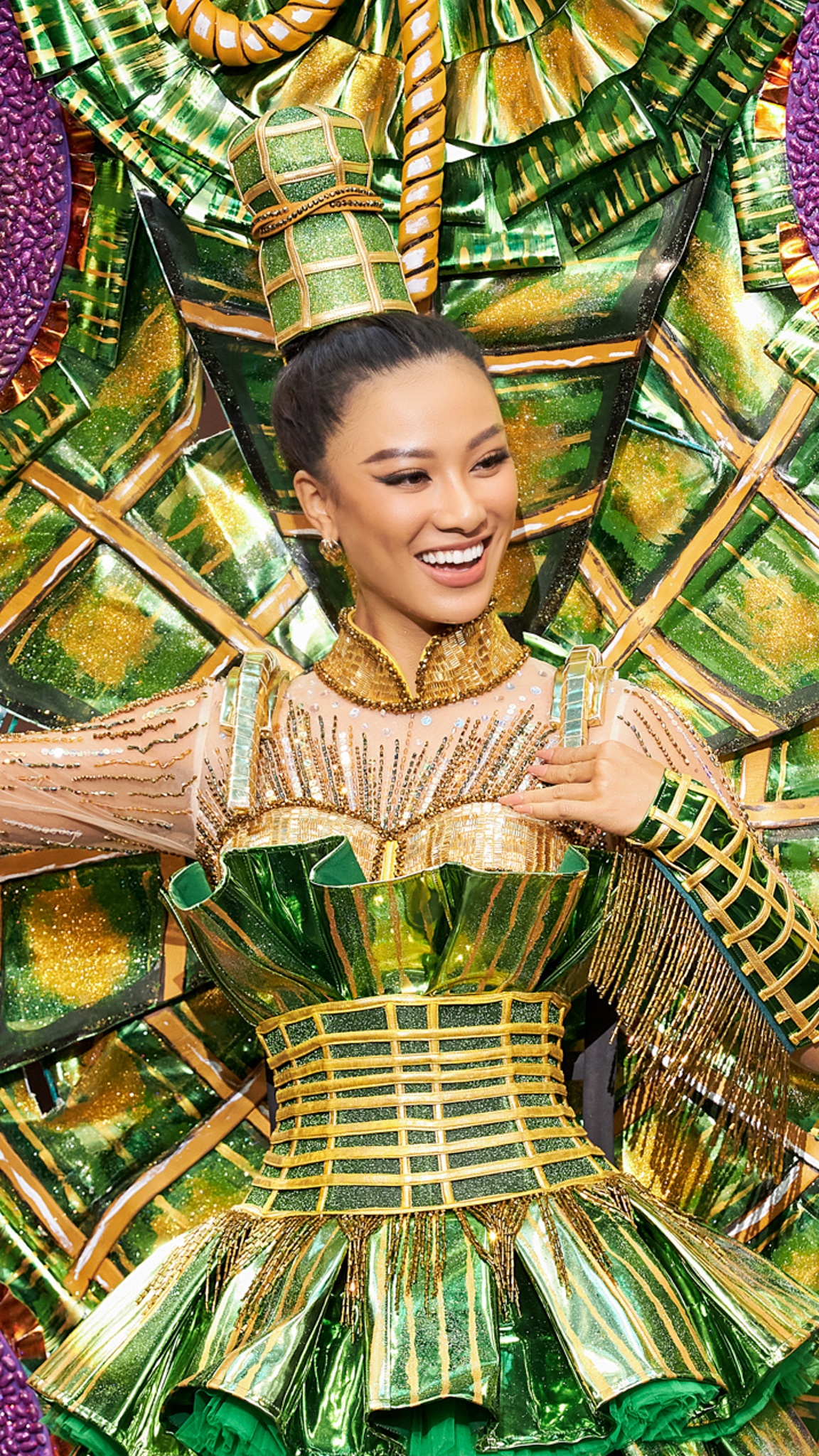 | Quê hương cũng là nguồn cảm hứng để tôi chọn bánh tét trong thiết kế trang phục truyền thống. Bánh tét gợi nhớ cho tôi về gia đình, quê hương, sự đoàn viên trong mỗi dịp lễ Tết. Tôi hy vọng bản thân tự tin hơn khi khoác lên mình trang phục có cảm hứng từ món bánh quen thuộc của người dân Nam bộ. |