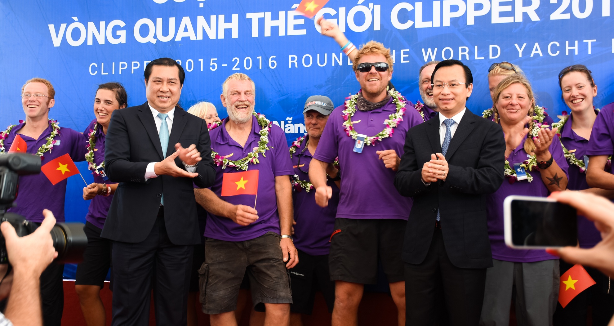 Đây là đội giành chiến thắng chặng 7 - chặng "Đà Nẵng - Khám phá mới của châu Á". Ông Nguyễn Xuân Anh, Bí thư Thành ủy Đà Nẵng, ông Huỳnh Đước Thơ, Chủ tịch UBND TP ra cầu cảng đón các thuyền viên. |