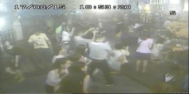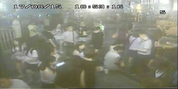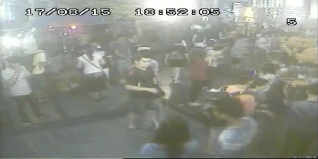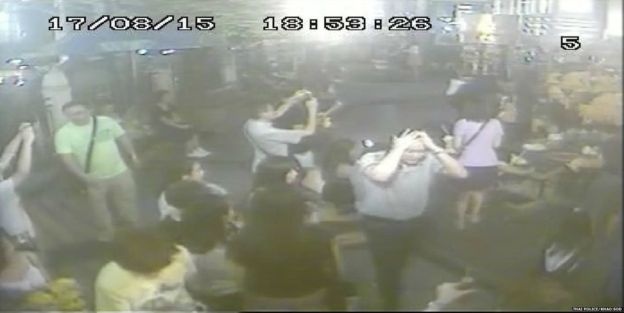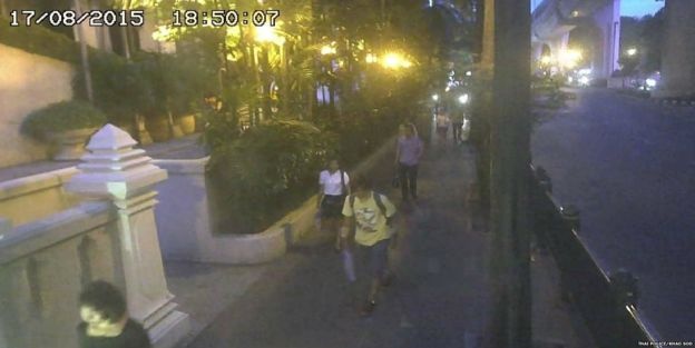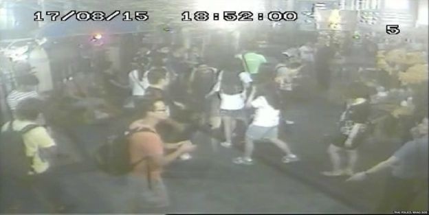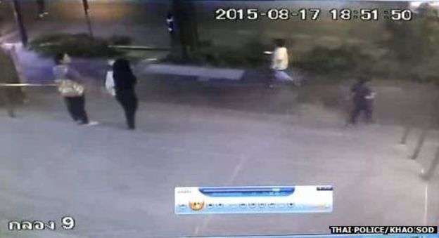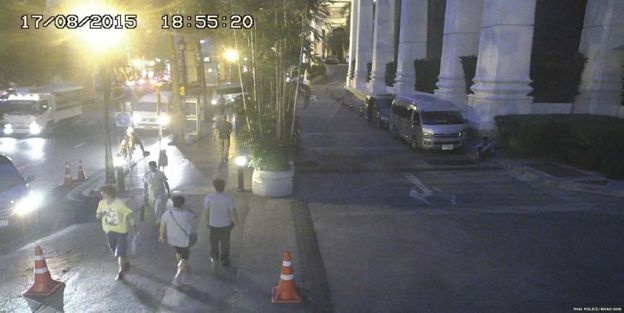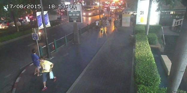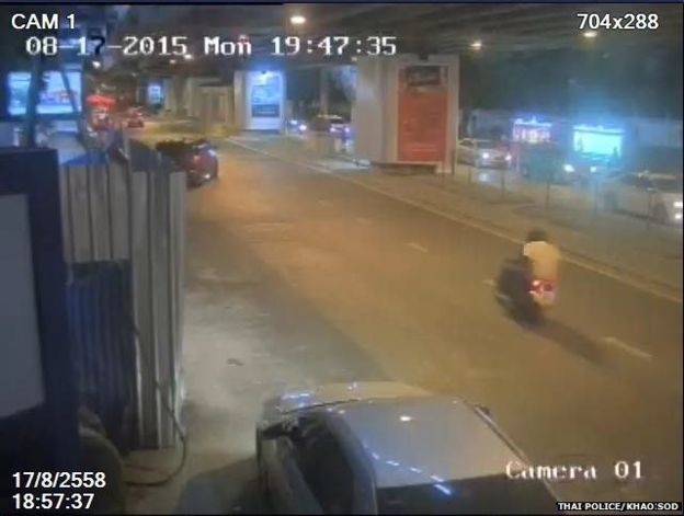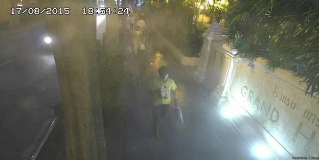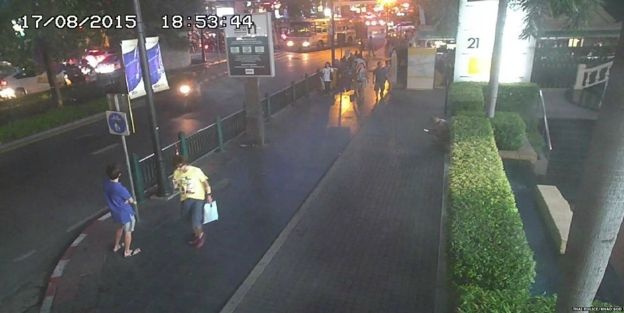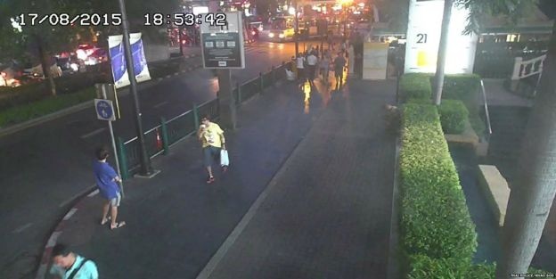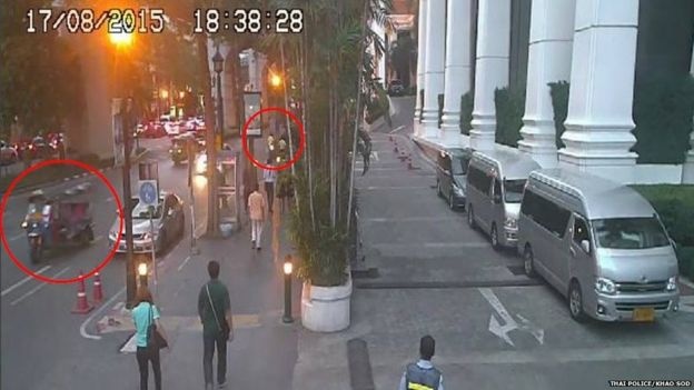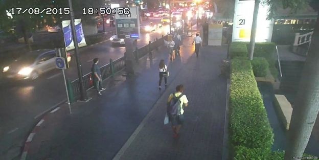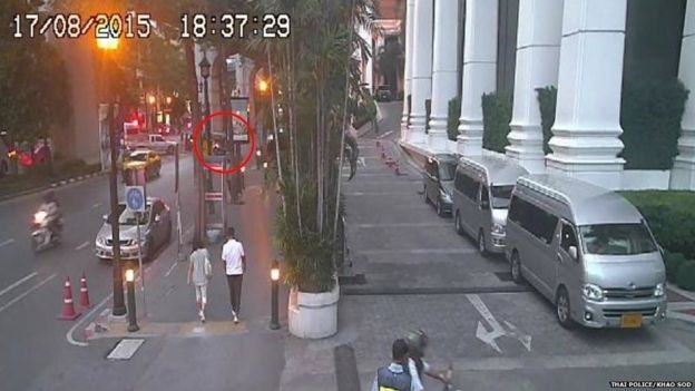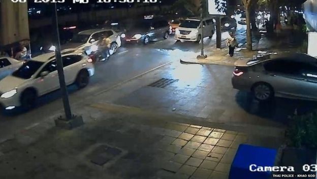| 18h36'52: Chiếc xe tuk-tuk chở nghi phạm dừng bên ngoài khách sạn Hyatt. Dựa vào hình ảnh, cảnh sát Thái Lan cho biết chiếc xe (phần lớn bị khuất) sang đường và đỗ bên ngoài khách sạn, gần đền Erawan. Từ 18h37'12 đến 18h37'35: kẻ tình nghi lấy ba lô và xuống xe. |