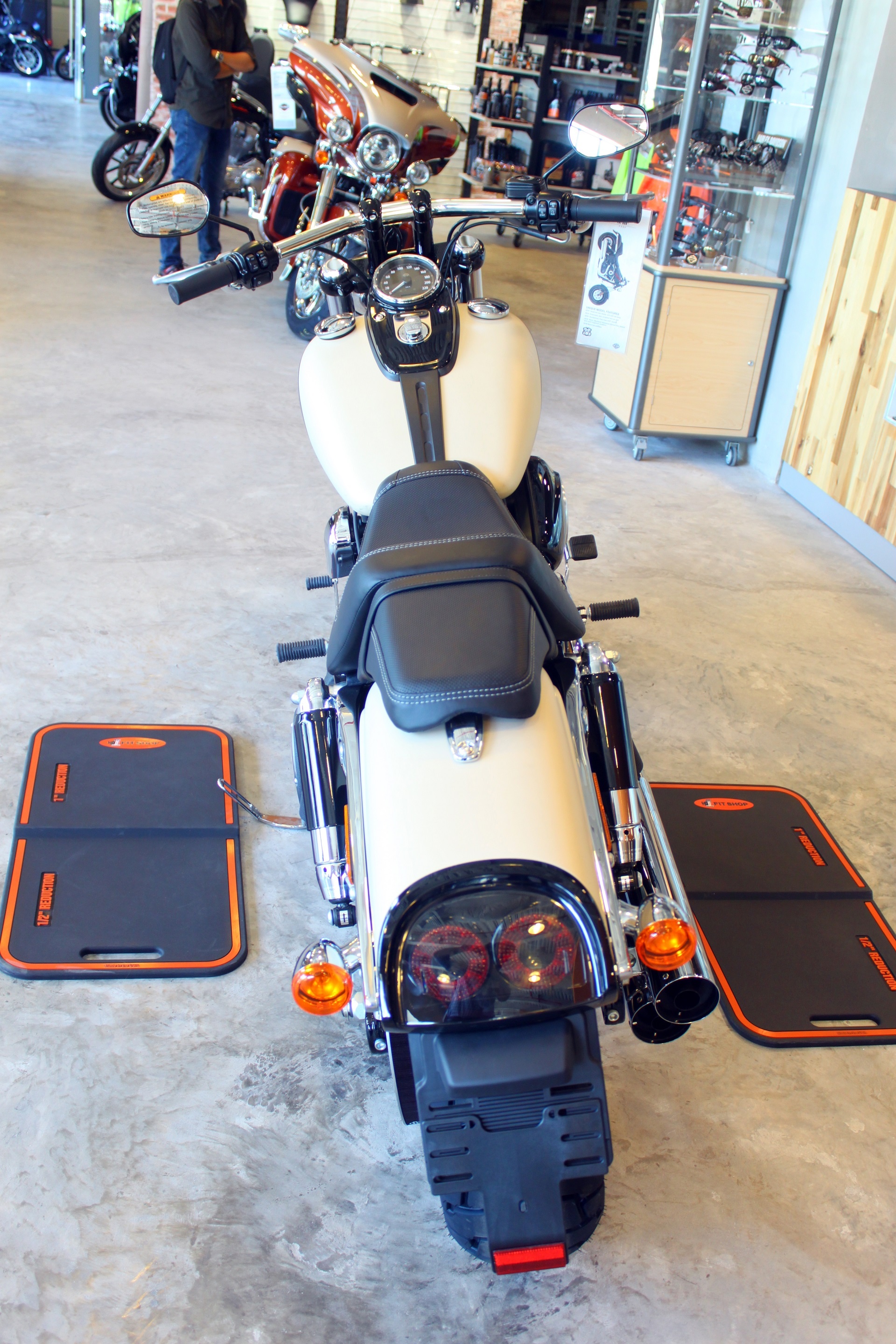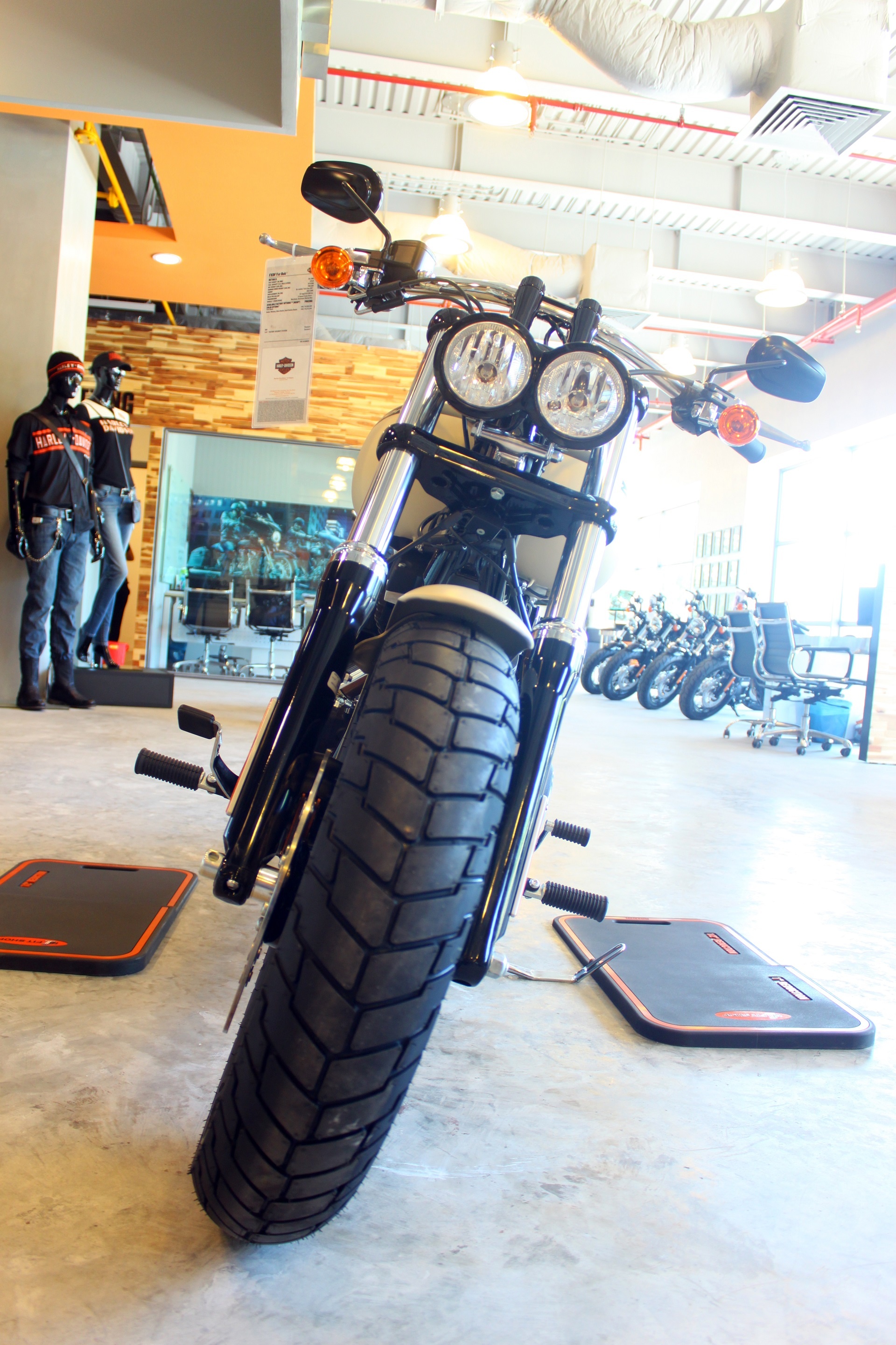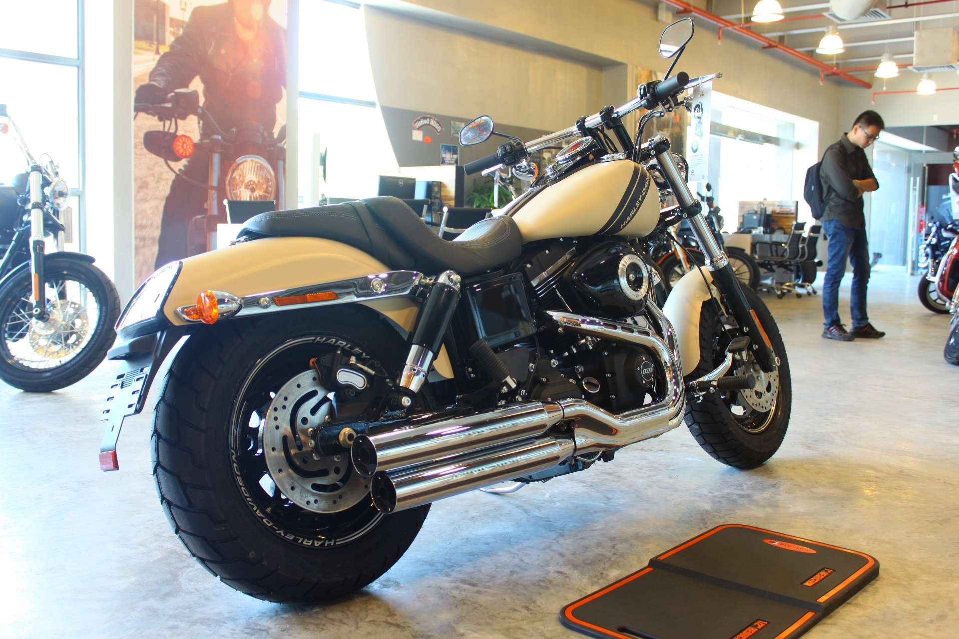 Mẫu Fat Bob 2014 vừa được Harley-Davidson nhập khẩu về TP HCM. Chiếc xe trong bài viết này có màu sơn vàng cát mờ mạnh mẽ.
