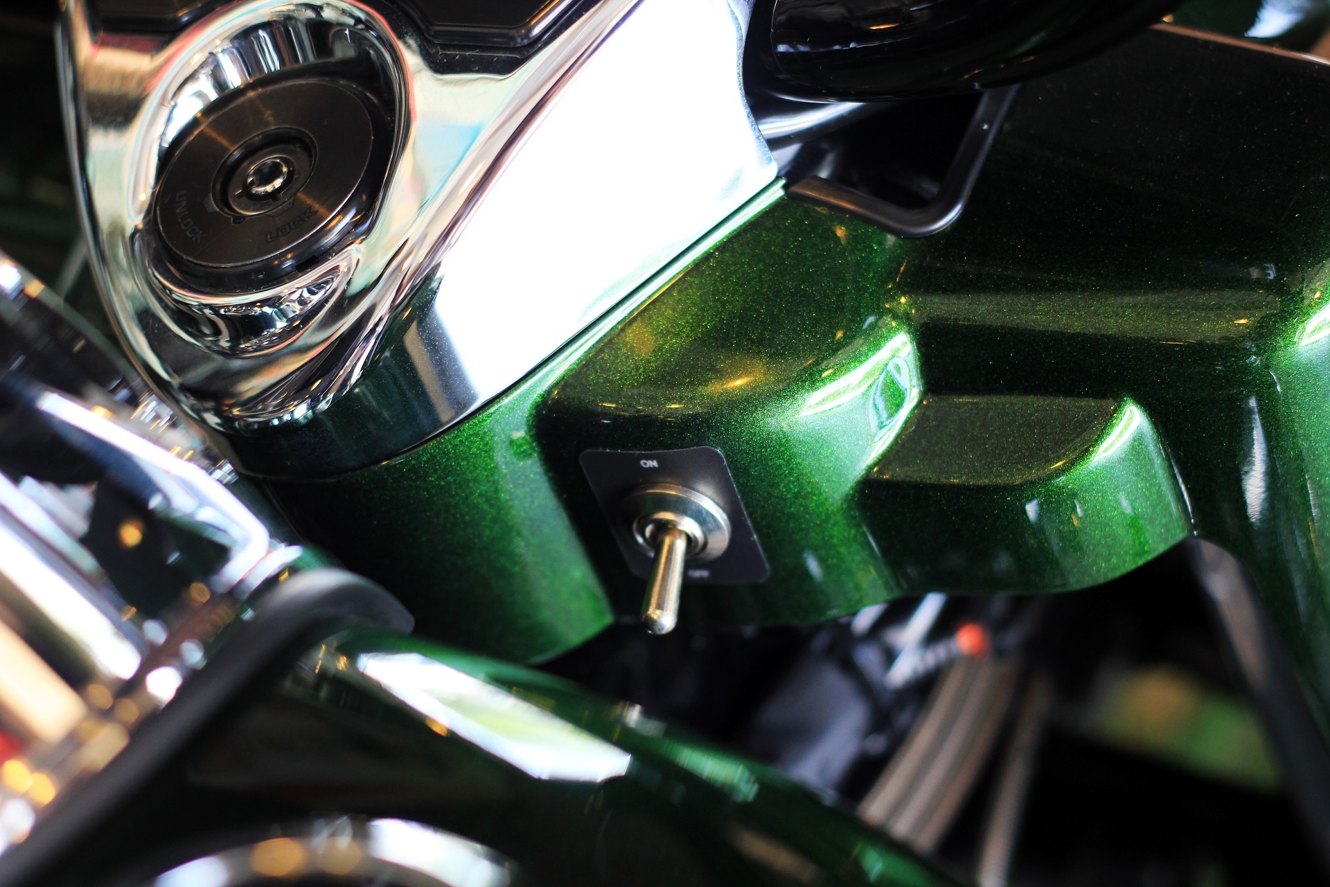 | Ổ khóa điện trên xe và một số công tắc được đặt phía trước bình xăng. Nước sơn trên xe được trau chuốt khá kỳ công nhằm tạo độ bóng và chống trầy xước. |