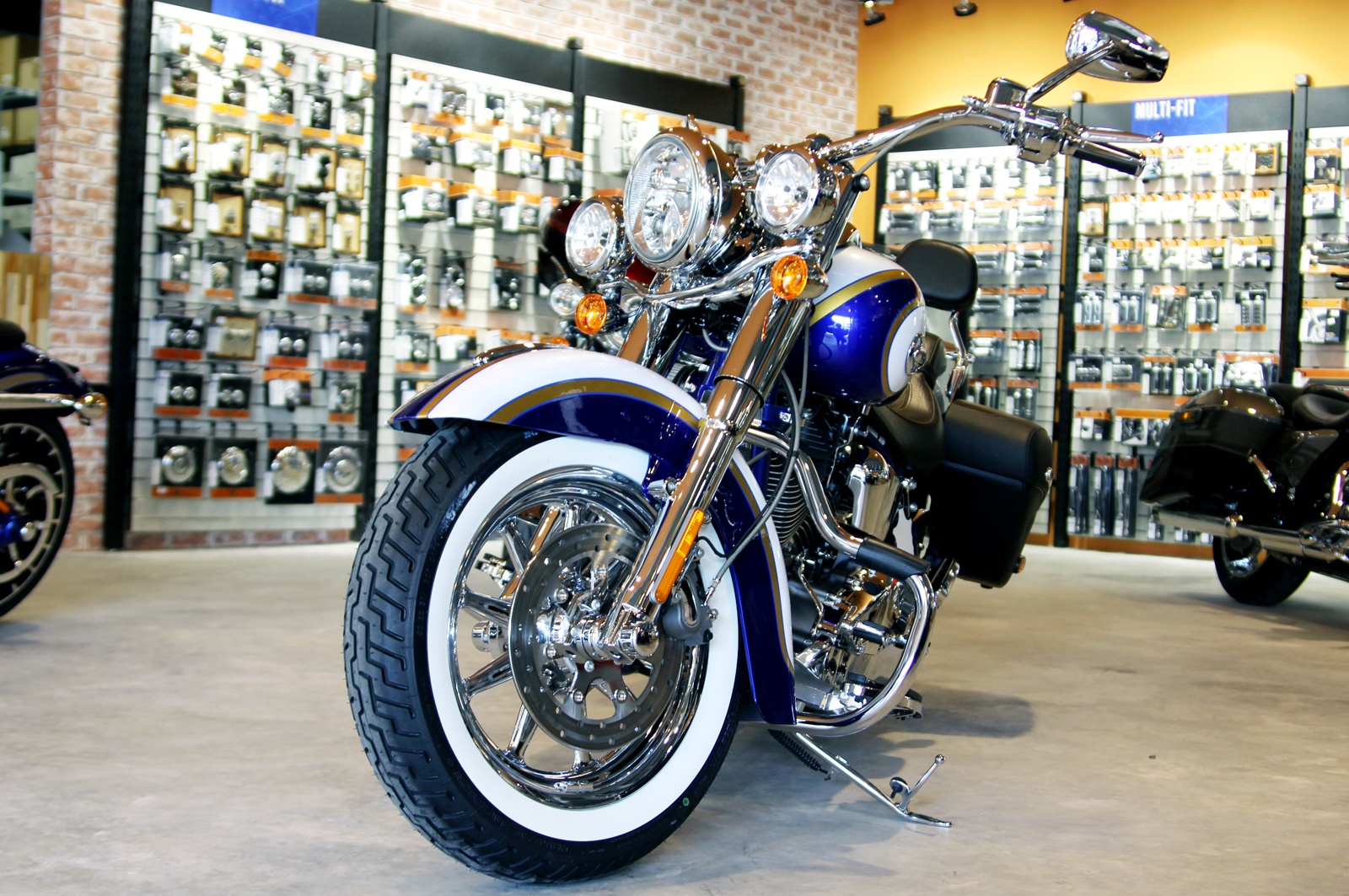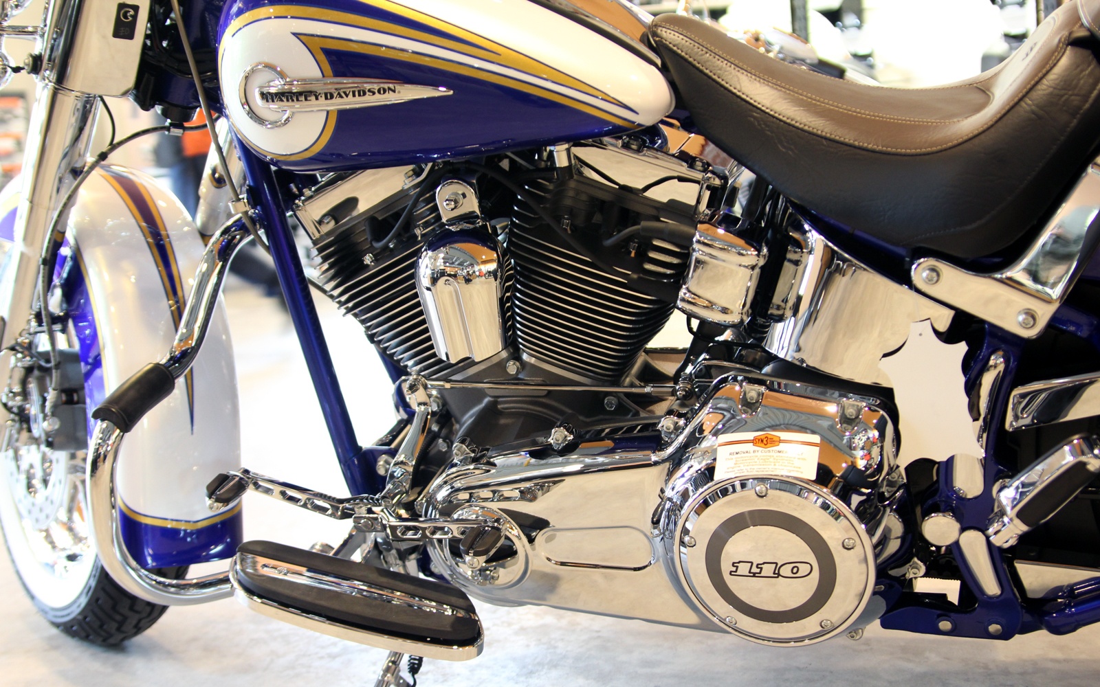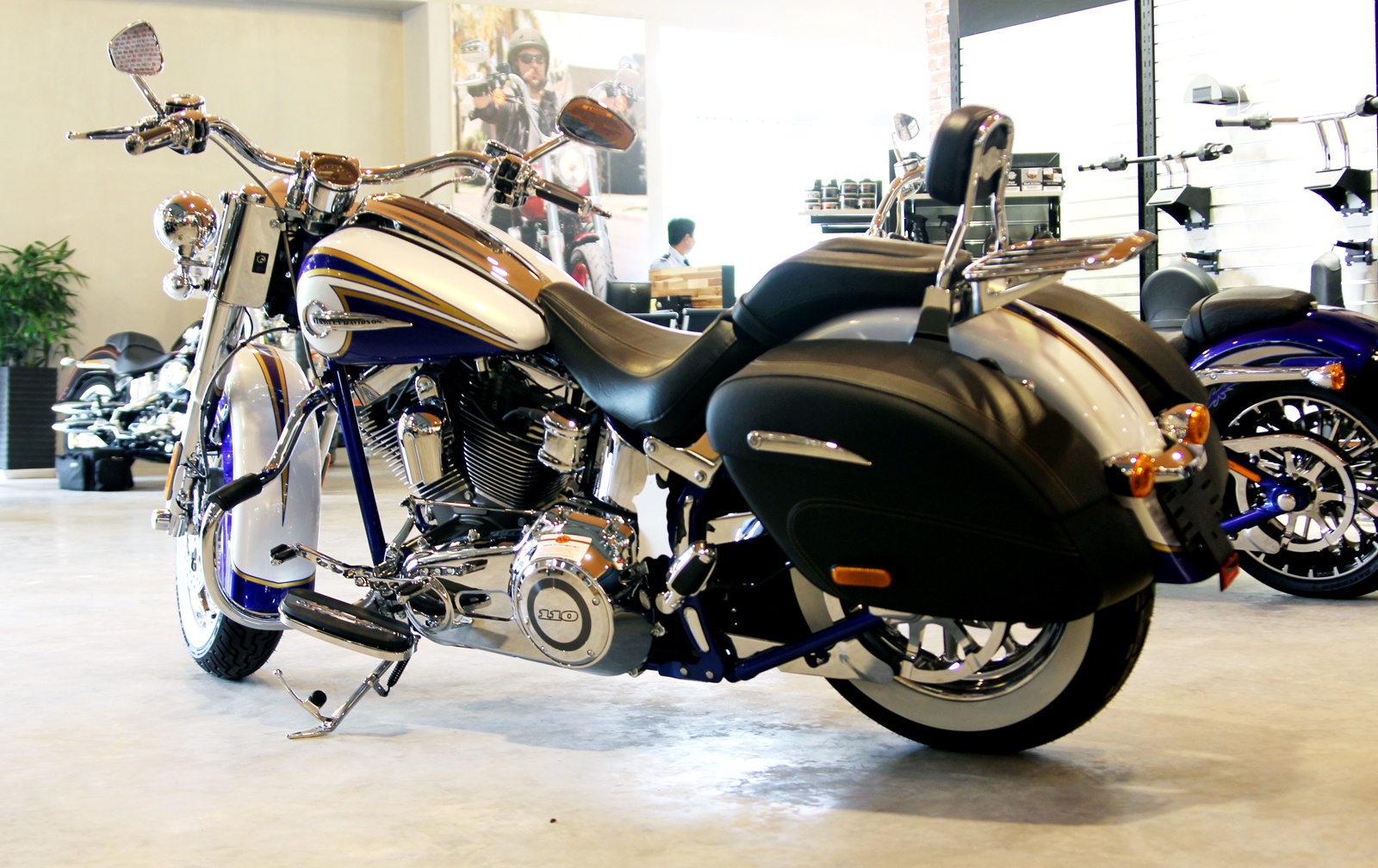 Mẫu xe đường trường CVO Softail 2014 Deluxe của Harley-Davidson bản chính hãng được nâng cấp với sơn thủ công hai màu trắng - xanh, có giá 1,4 tỷ đồng.