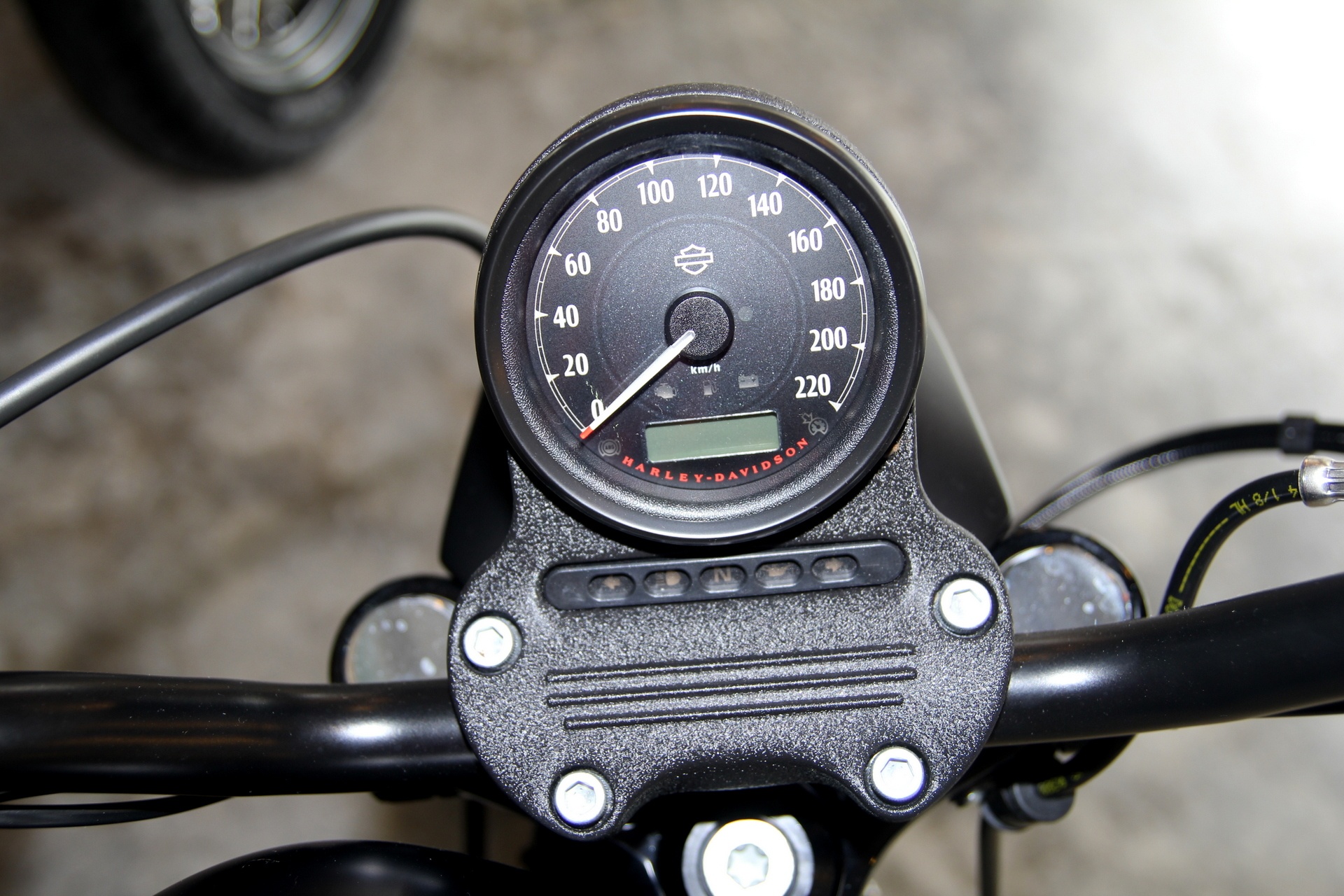 | Bảng điều khiển trung tâm chỉ có đồng báo tốc độ và dải màn hình LCD đơn sắc khá nhỏ. Nhìn chung, Sportster Iron 883 là mẫu xe đề cao sự đơn giản nhằm tiết kiệm chi phí. |