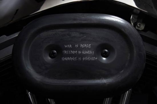 | Hệ thống ống xả được nâng cấp 2 trong 1 đến từ Screaming Eagle. Và lốp xe tiện dụng cho việc di chuyển hàng ngày chính là Bridgestone Spitfires. Đương nhiên, tất cả mọi thứ trên chiếc xe đều được đánh bóng rất kĩ, không hề có dấu hiệu của việc mạ crôm trên chiếc xe này. "Với chiếc xe của chúng tôi, chúng tôi xem xét để tạo ra tác động thay đổi nhận thức đối với người xem, và điều này không nhất thiết có nghĩa là phải làm hài lòng tất cả mọi người. Vì vậy, chúng ta sẽ không có cách nào khác để đón nhận một cách dễ dàng rất nhiều ý kiến trái chiều như là những phản ứng mạnh mẽ của sự thù ghét và coi thường, đặc biệt là từ các quan điểm bảo thủ trong nền văn hóa biker”. |