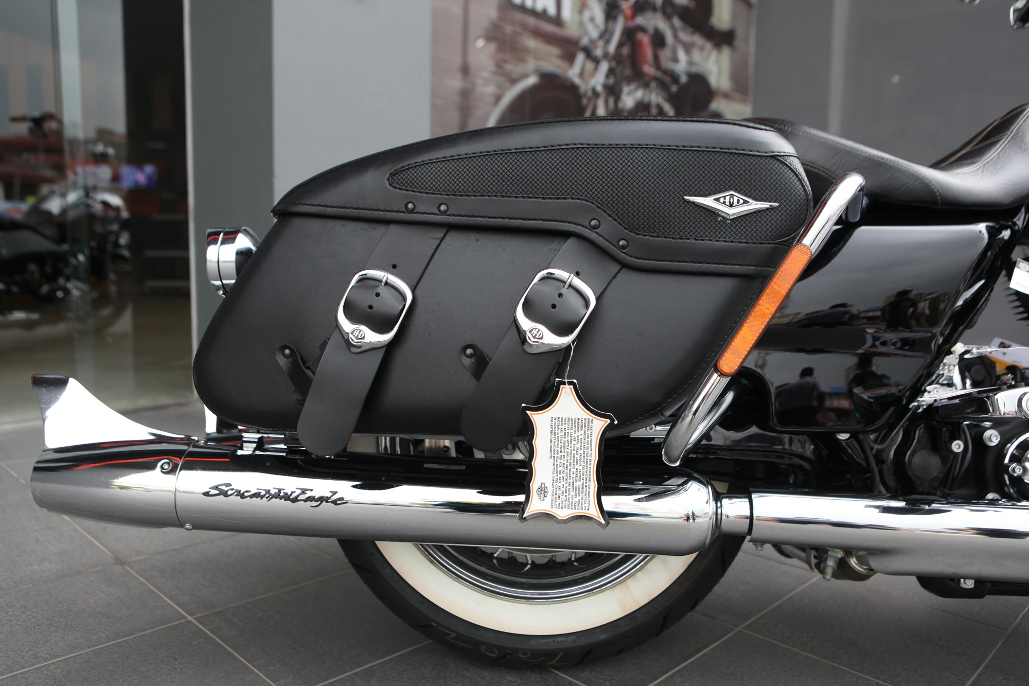 | Hai bên hông được trang bị túi da tiện lợi trong những hành trình dài. Ngoài ra, cặp ống xả mới hiệu Screaming Eagle và nắp chụp ống xả kiểu đuôi cá khiến chiếc xe trở nên độc đáo. |
