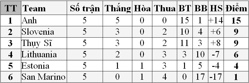 | Xếp hạng bảng E vòng loại EURO 2015 sau 5 lượt trận. |