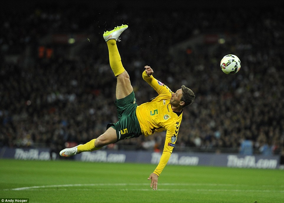 | Nỗ lực cản phá của hậu vệ Tomas Mikuckis bên phía Lithuania trước sức ép rất lớn từ các cầu thủ chủ nhà. |