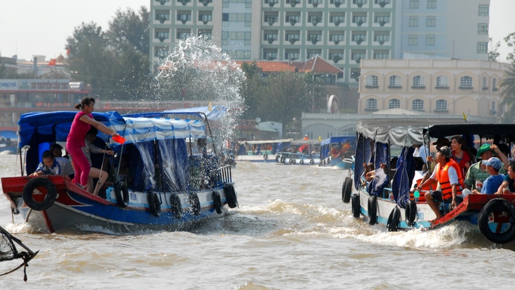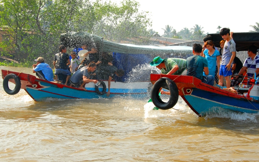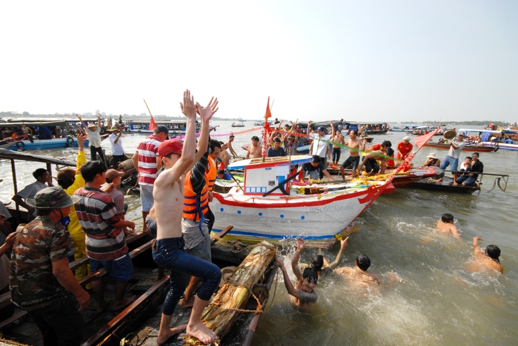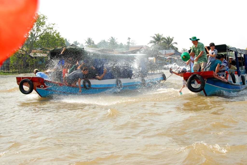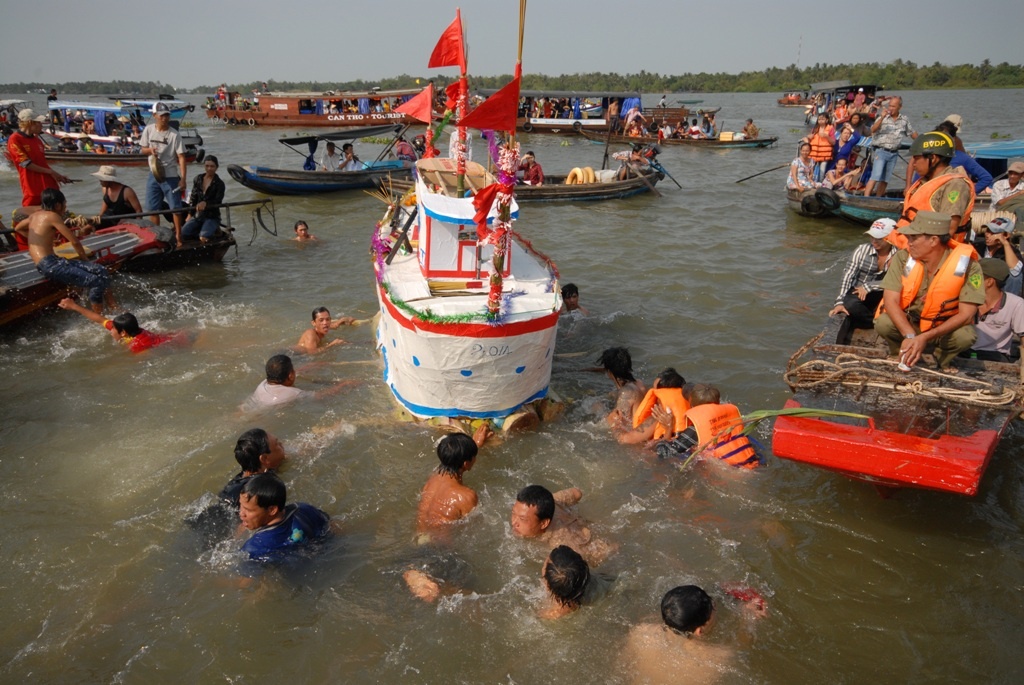 Sau khi thả thuyền xong, các thanh niên ăn mừng bằng cách hắt nước vào người nhau để tống tà khí, cầu may mắn giữa sông Hậu.