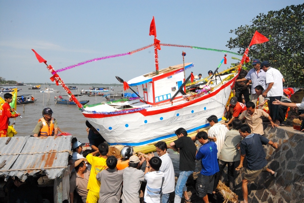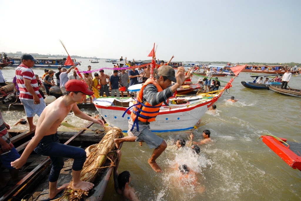 | Theo tục lệ, trong lúc đưa thuyền xuống sông người khiêng phải đi thật nhanh, tuyệt đối không dừng, quay đầu lại. |
