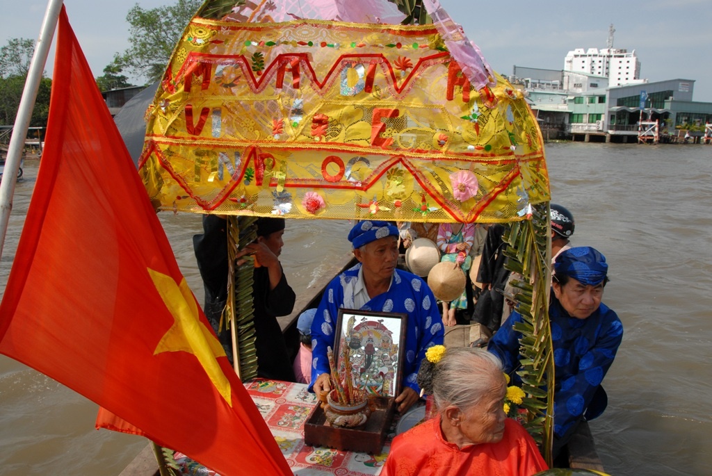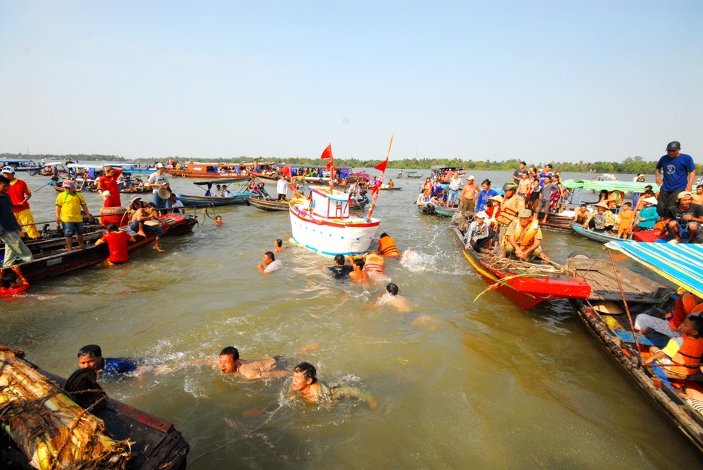 Đưa thuyền ra giữa sông Hậu để thực hiện nghi lễ.