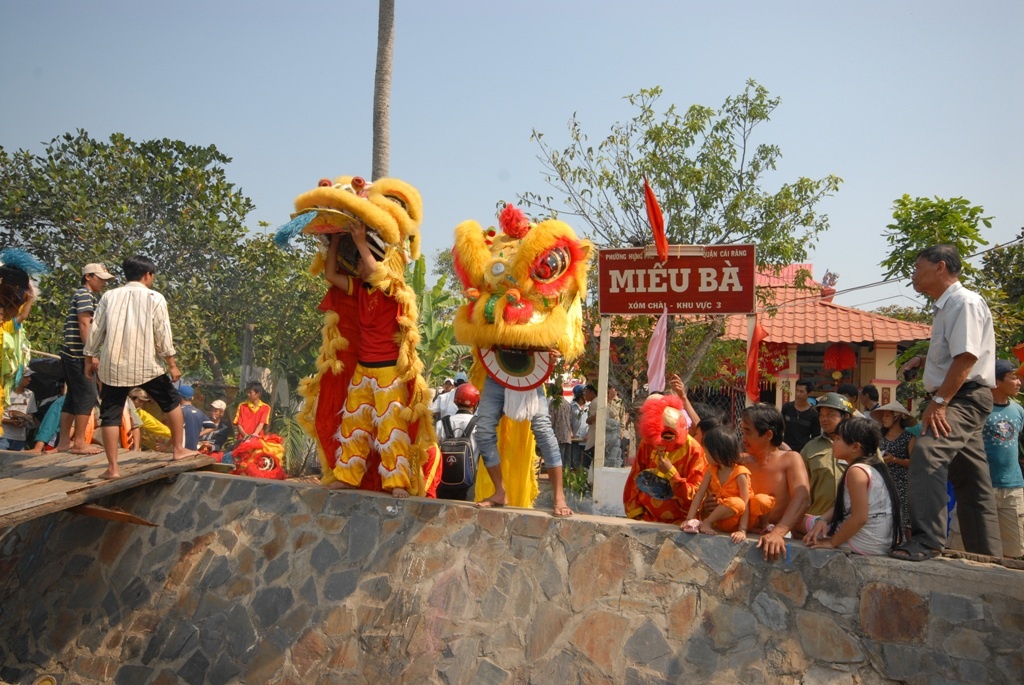 Nghi lễ múa lân hướng ra sông để cầu an trước miễu Bà xóm Chài.