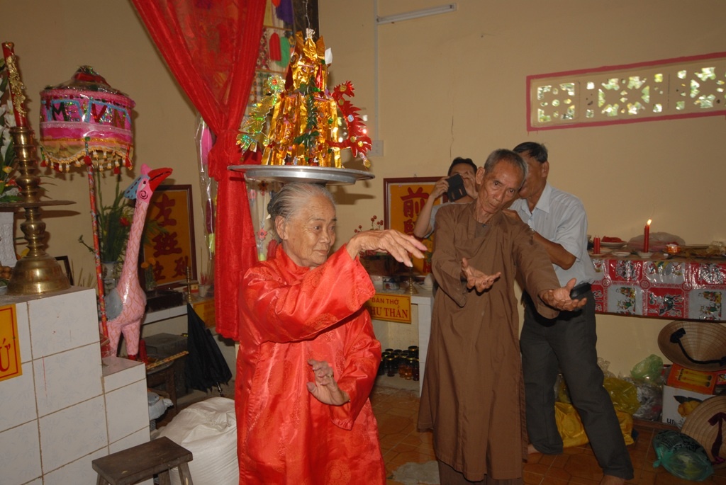 Hai cụ già với màn múa mâm vàng ở bàn thờ Bà.
