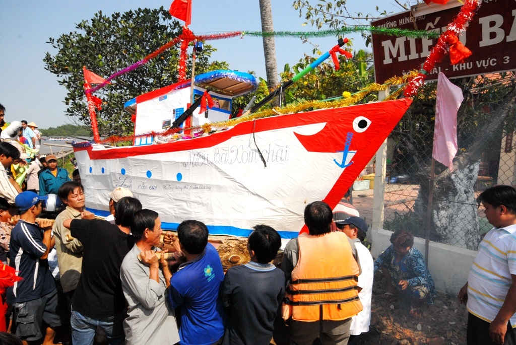 Trước ngày hành lễ, ban tổ chức làm một chuyến thuyền bằng tre khá lớn rồi đặt trước miếu thờ, mũi bè hướng ra sông. Ban tế lễ bỏ nhang đèn, vàng mã, tiền thật, gạo, muối, bánh mứt, trái cây, gà, thịt, cá… vào khoang thuyền để cúng binh ôn và cô hồn.