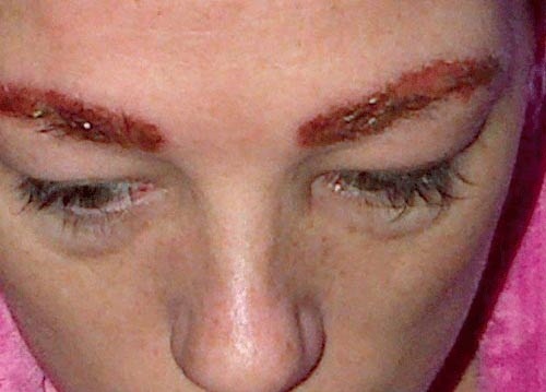 Sau một tuần, vết xăm tróc mày, hết sưng nhìn vào gương chị bàng hoàng phát hiện hai bên lông mày quá xếch không hài hòa với khuôn mặt, chị trở lại thẩm mỹ viện yêu cầu sửa. Tuy không mất thêm tiền nhưng chị phải chịu đựng cái đau rát do tác động của tia laser xóa xăm để tạo vết phun xăm mới.