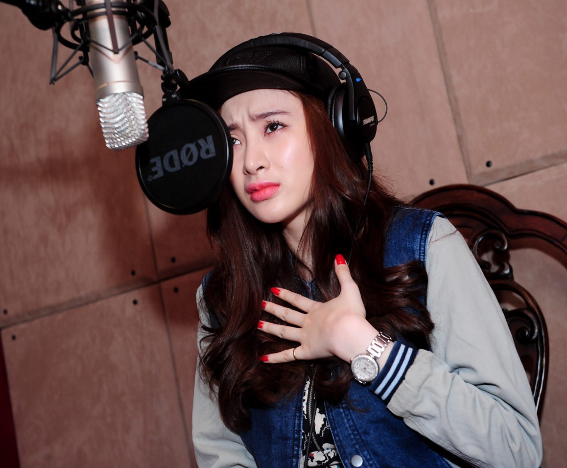 | Vừa trở về từ chuyến đi Singapore quay quảng cáo cho một nhãn hàng, Angela Phương Trinh đến phòng thu lúc 22h để kịp thu âm cho nhân vật Tâm Lan trong bộ phim Hoàng Phi Hồng - Giấc mộng người anh hùng do Angelababy đảm nhận. |