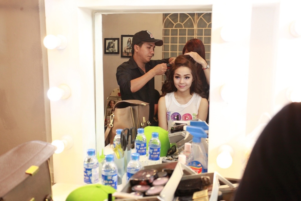 Minh Hằng đến khá sớm để chuẩn bị cho buổi chụp hình. Từ gương mặt mộc, cô được chuyên gia trang điểm "phù phép" trở nên xinh đẹp và quyến rũ.