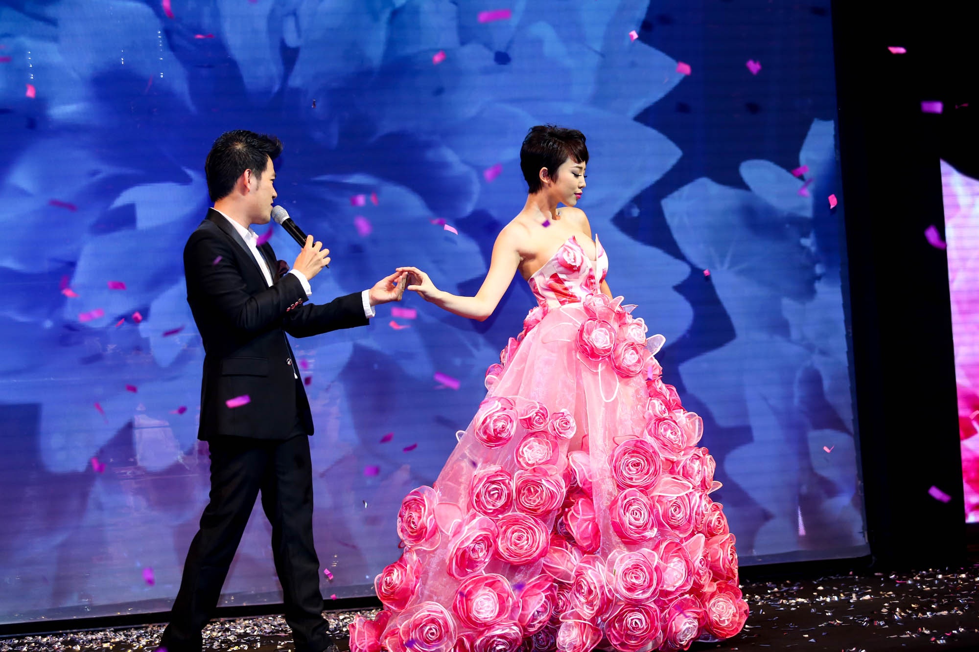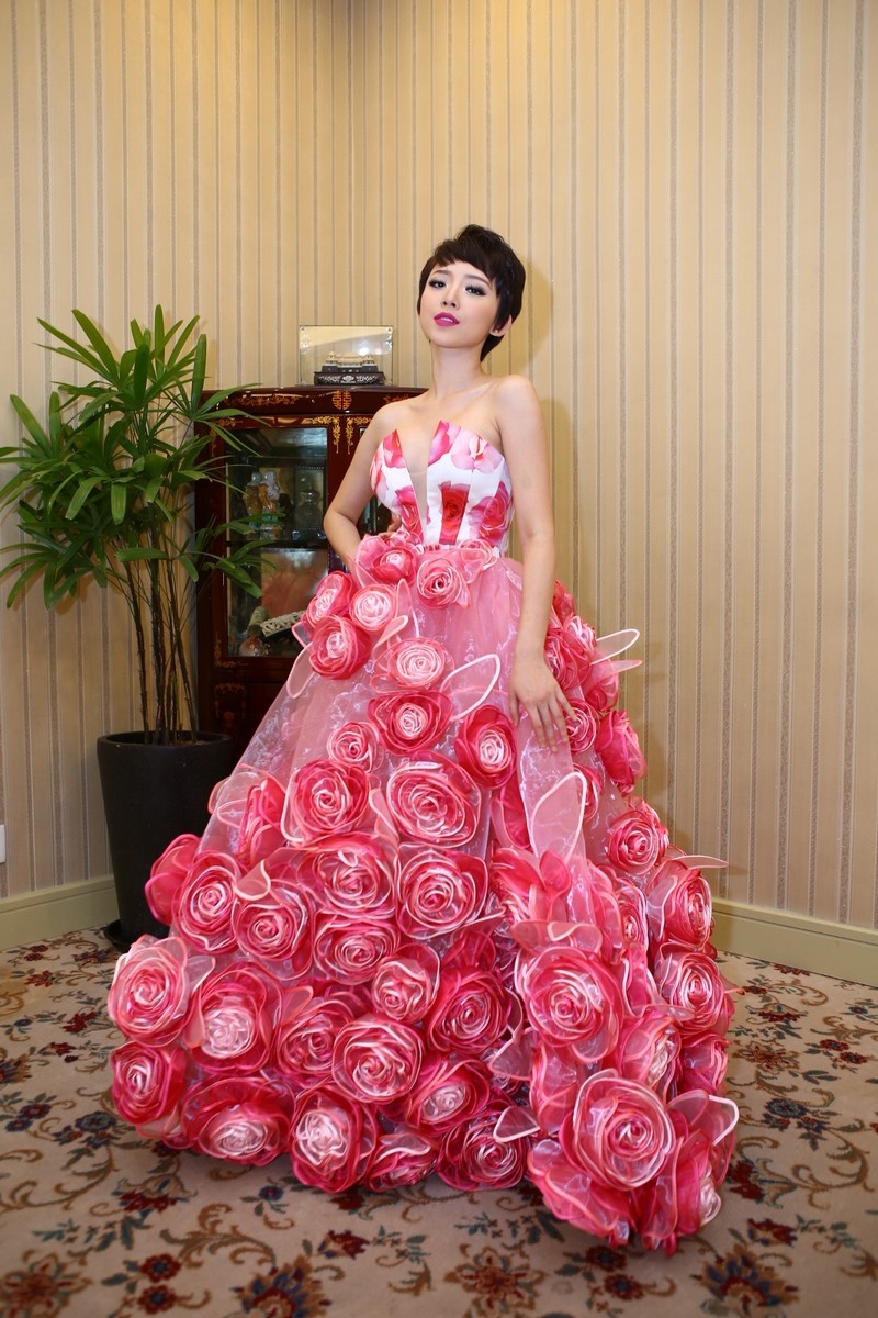 Thiết kế do Tóc Tiên trình diễn được tạo kiểu khá công phu với những bông hoa hồng lớn được kết trên váy. Phần ngực áo khá gợi cảm với đường xẻ chữ V sâu.