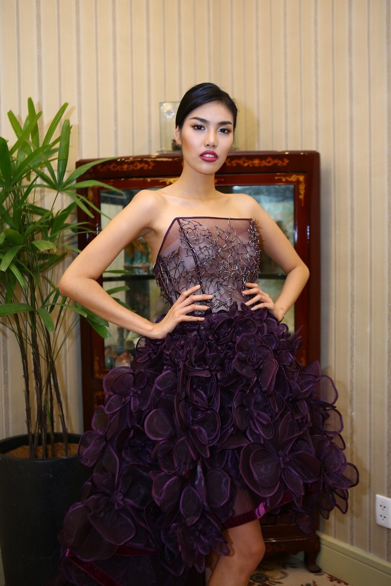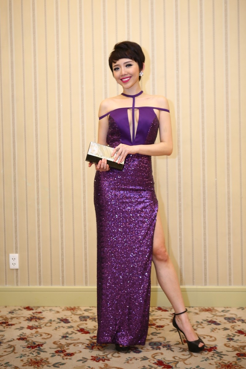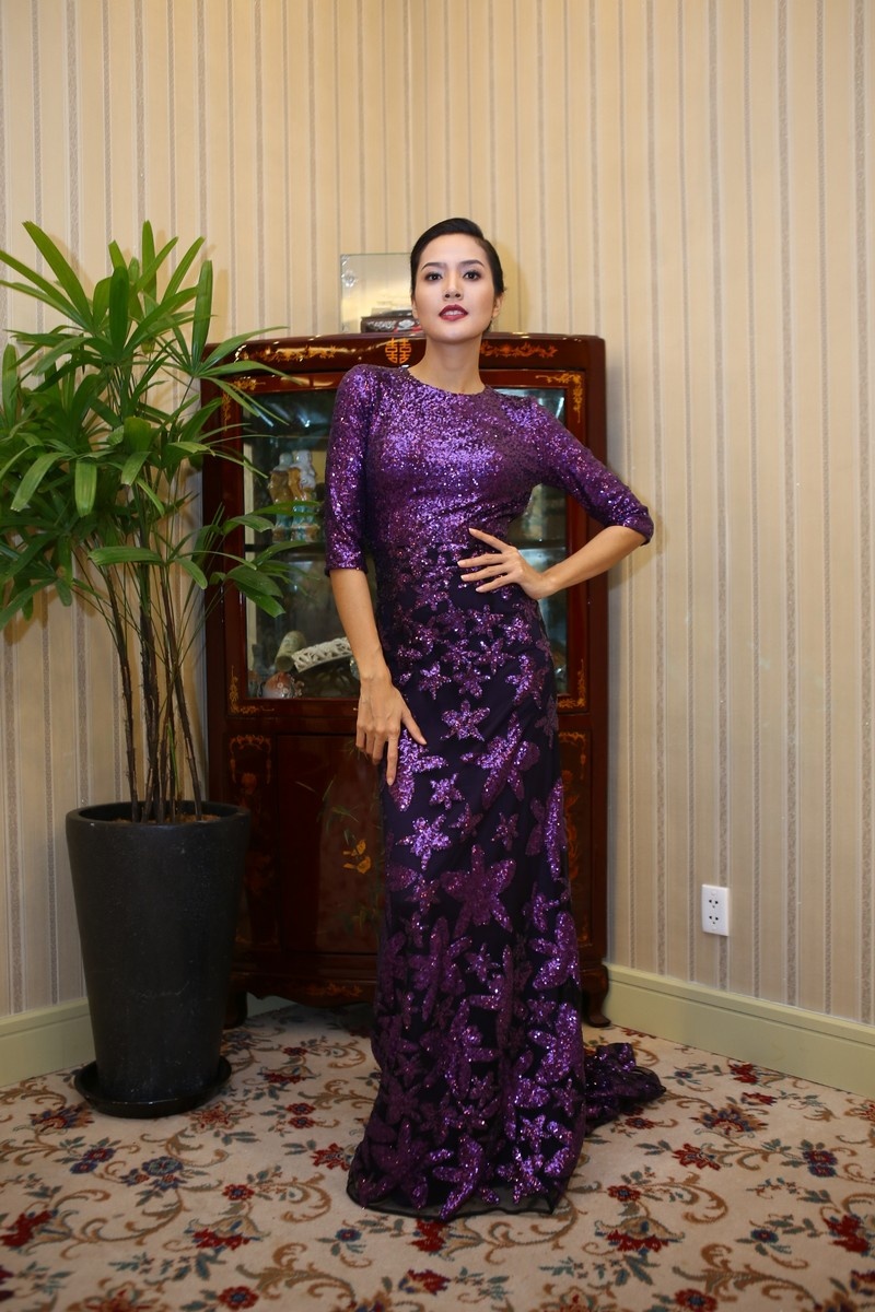 Người mẫu Quanh Đi sang trọng trong mẫu váy màu tím ánh bạc.