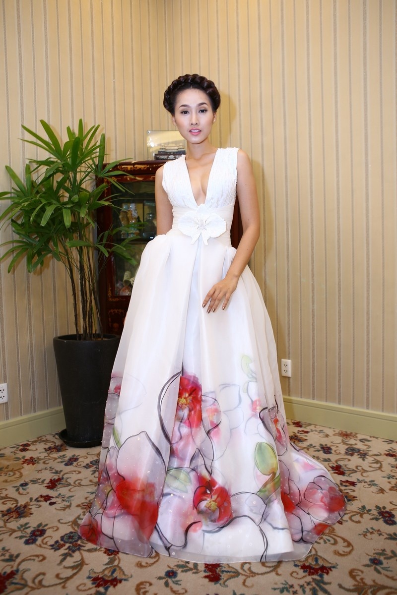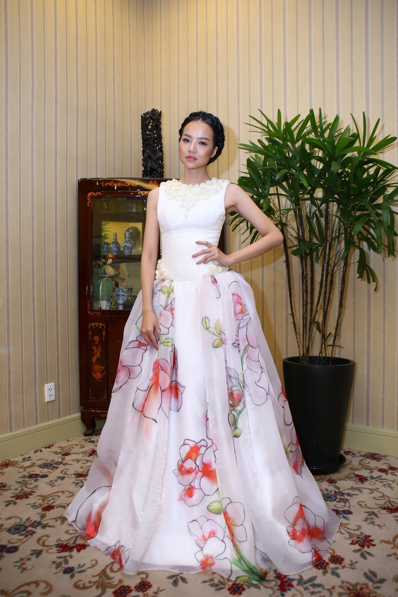 Nữ người mẫu thể hiện bộ váy dài nữ tính, sang trọng. Cô là gương mặt khá quen thuộc trên nhiều sàn diễn thời trang trong nước.