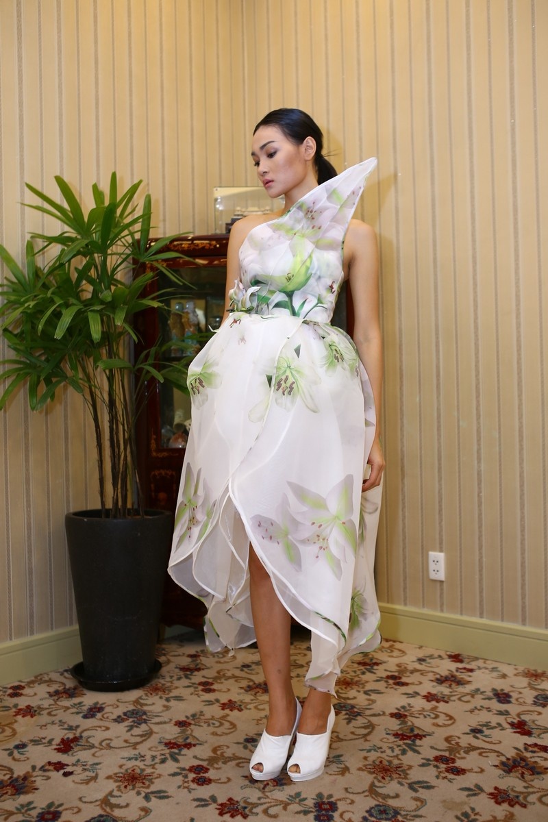 Minh Tú trình diễn mẫu váy in hoa lạ mắt, có đường xẻ giữa thân váy rất hiện đại.