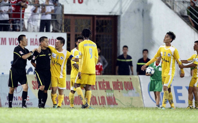 | Tâm điểm của trận đấu là tình huống trọng tài Trần Trung Hiếu thổi penalty cho đội khách Quảng Nam ở cuối hiệp 1. Các cầu thủ Hải Phòng phản ứng rất mạnh, trong đó thiếu kiềm chế nhất là trung vệ Đinh Tiến Thành. |