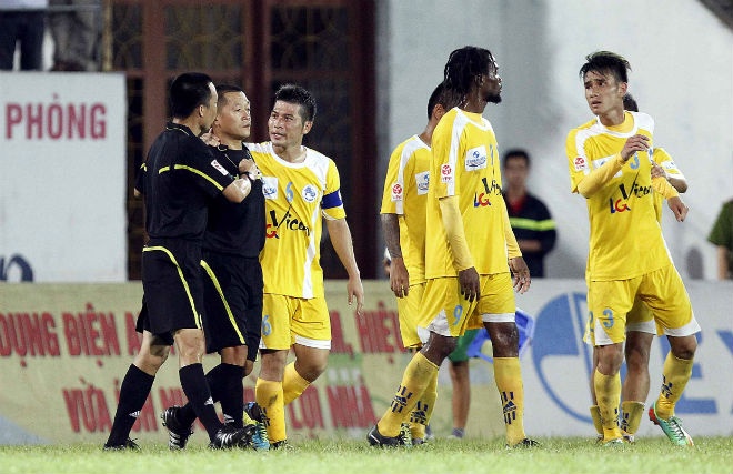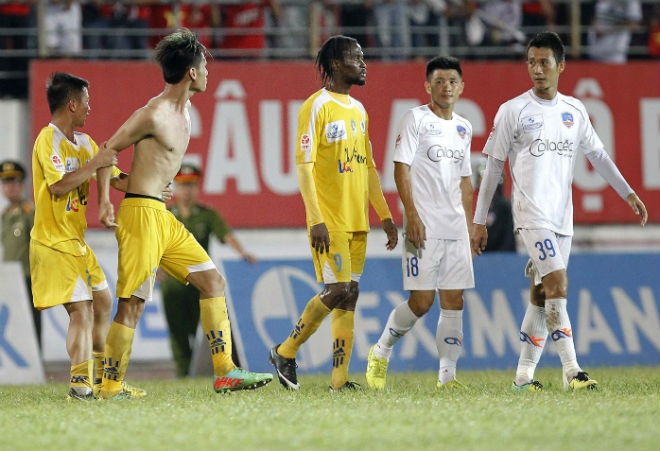 | Khi trận đấu kết thúc, trung vệ Đinh Tiến Thành vẫn tỏ ra nóng nảy nhất khi cởi áo và định lao vào trọng tài. Anh được đồng đội giữ lại để tránh xảy ra chuyện không hay. |