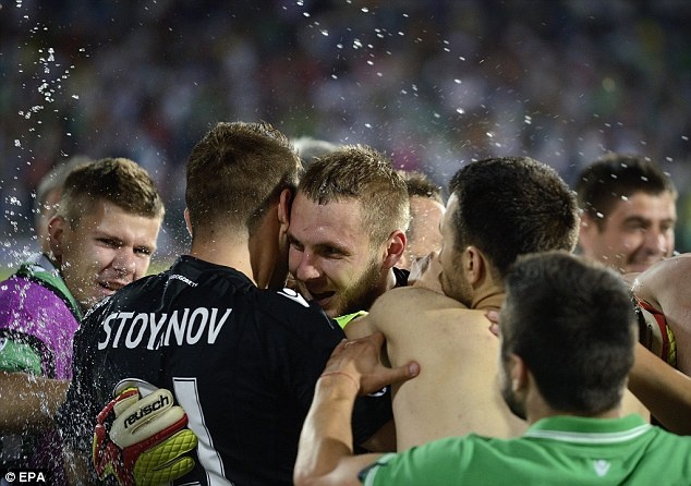 | Hậu vệ Cosmin Moti trong vòng vây của các đồng đội. Ảnh: Daily Mail |