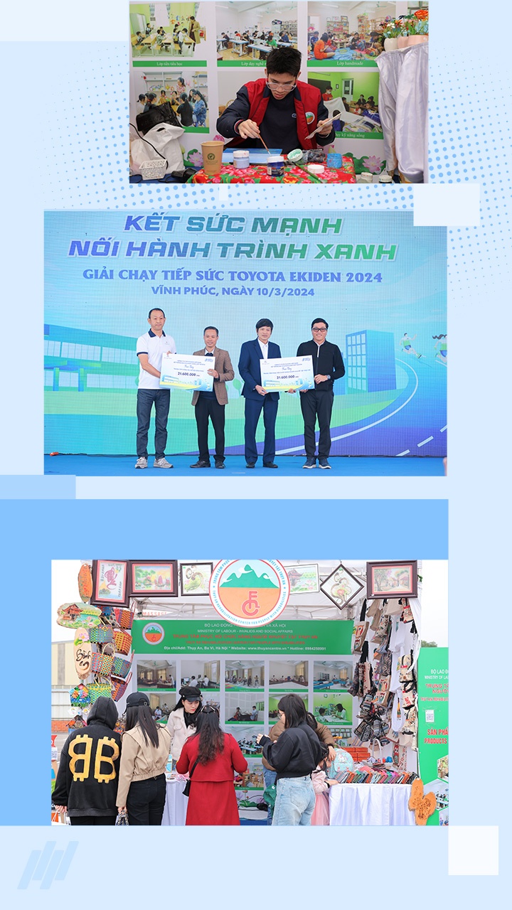 Cũng trong khuôn khổ giải chạy Toyota Ekiden 2024, hãng xe Nhật tổ chức hoạt động quyên góp từ các đội chạy và tất cả thành viên tham dự. Số tiền quyên góp được trao tặng Trung tâm bảo trợ xã hội tỉnh Vĩnh Phúc và Trung tâm phục hồi chức năng người khuyết tật Thuỵ An (Sơn Tây, Hà Nội).