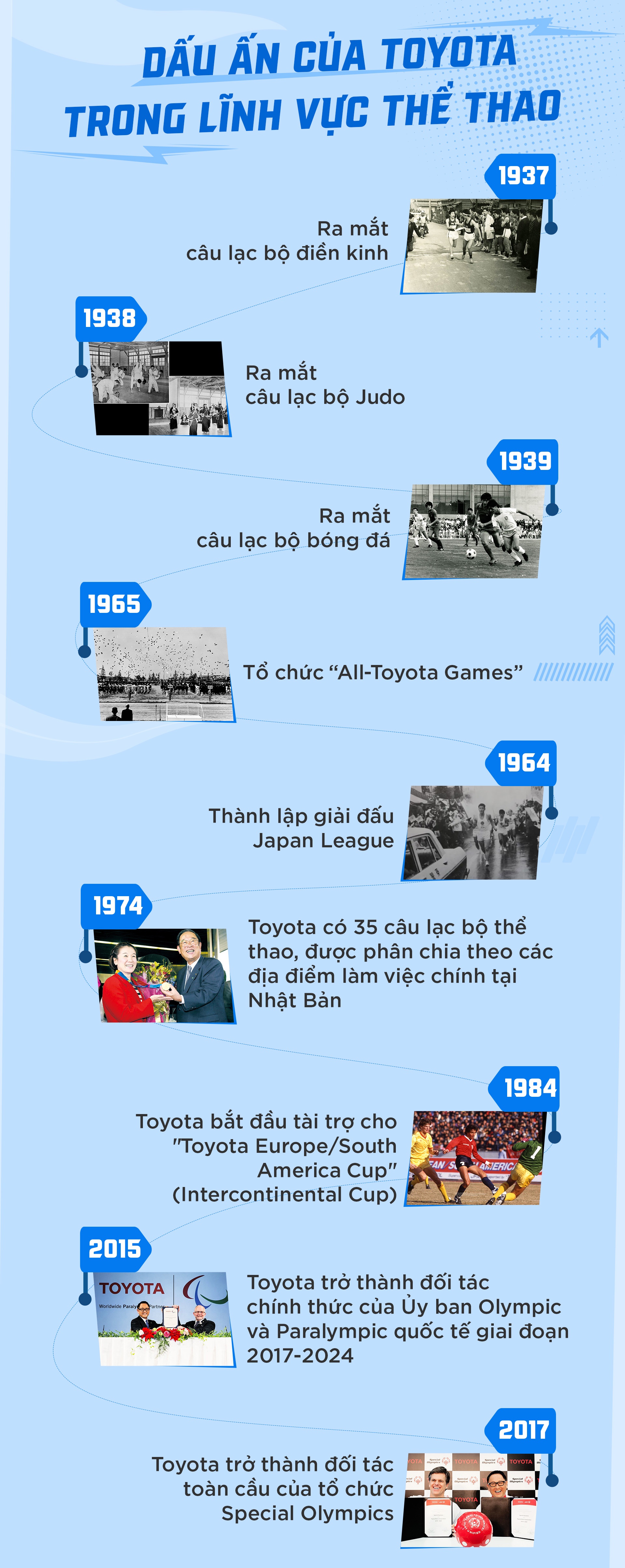 Với sứ mệnh “tạo ra một xã hội hòa bình, không phân biệt đối xử thông qua thể thao và cam kết tạo ra một xã hội bền vững thông qua chuyển động”, Toyota thúc đẩy sự kết nối giữa thể thao và mang đến giải pháp di chuyển cho mọi người. Tinh thần này hiện diện từ những ngày đầu thành lập và trở thành động lực để người sáng lập Kiichiro Toyoda xây dựng câu lạc bộ thể thao đầu tiên của tập đoàn vào năm 1937. Từ đó, thương hiệu này luôn song hành cùng lĩnh vực thể thao, bổ sung nhiều câu lạc bộ với đa dạng bộ môn, trở thành đối tác toàn cầu của Thế vận hội Olympic và Paralympic.