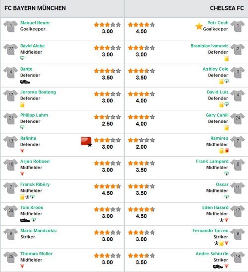 Về phía Hùm xám xứ Bavaria, tiền vệ Ribery được chấm điểm 4.5/5 khi tung ra cú sút khiến thủ môn Petr Cech không có cơ hội cản phá. Cầu thủ xuất sắc nhất châu Âu 2013 chính là nhân tố quan trọng đem về danh hiệu Siêu Cup châu Âu cho Bayern.