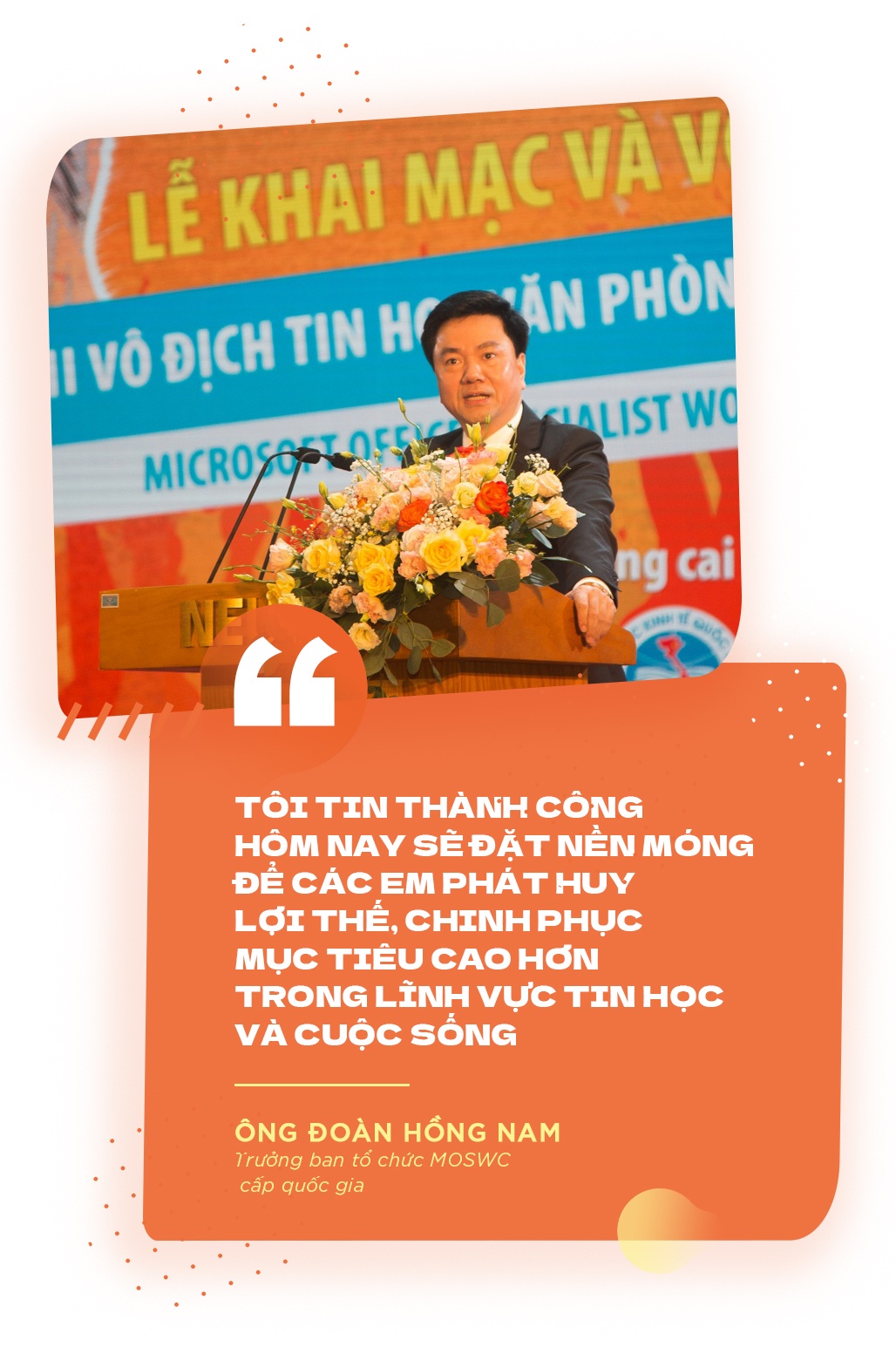 Huy và Phát yêu thích công nghệ, tin học từ lâu, cả hai thường thực hành các thao tác trên máy tính. Song chỉ đến khi tiếp xúc với chương trình giảng dạy MOS (Microsoft Office Specialist - bài thi về kỹ năng tin học văn phòng triển khai bởi Tập đoàn Khảo thí Tin học danh tiếng Certiport của Mỹ, được áp dụng trên 150 quốc gia và vùng lãnh thổ trên thế giới), được thầy cô động viên, hướng dẫn, cả hai mới quyết định thử sức ở đấu trường MOSWC.