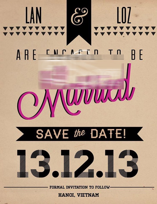 | Thiệp mời hiện đại dành cho bạn bè của cặp đôi trẻ Lan và Loz được gửi gắm đến mọi người với sự trân trọng và nhắc nhớ ngày 13/12 là ngày cô lên xe hoa. |