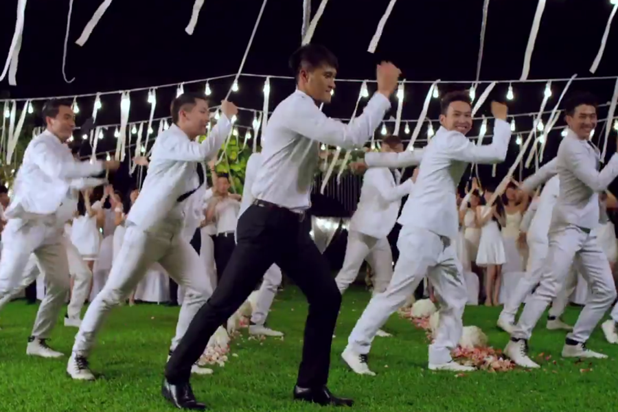 Ê kíp với hơn 100 diễn viên quần chúng cũng khoác lên người toàn bộ trang phục màu trắng để chuẩn bị cho lễ cưới của cặp đôi này. Lấy bối cảnh ngoài trời, đám cưới này cũng được trang trí với 300 bóng đèn cùng những dải lụa trắng.