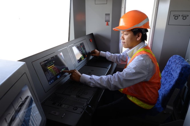 | Kỹ sư cơ điện gói thầu số 3 tuyến metro Bến Thành - Suối Tiên ngồi thử buồng lái đầu tàu metro mẫu. |