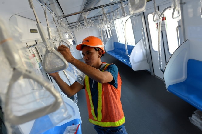 | Công nhân của gói thầu số 3 tuyến metro Bến Thành - Suổi Tiên bọc các tay cẩm để bảo quản. Bên trong khoang tàu được trang bị rất nhiều tay cầm cho người đứng. |
