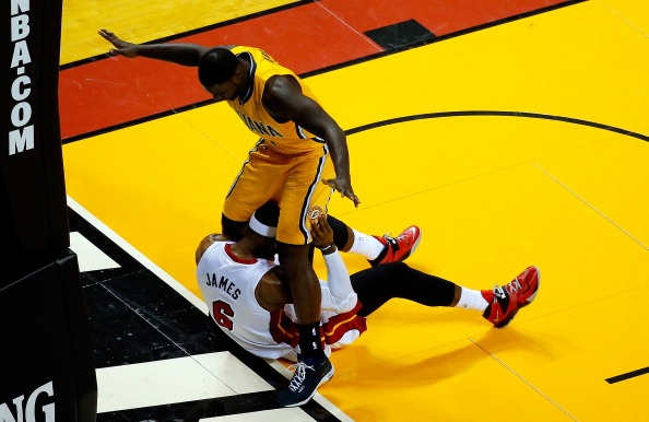 | Tính chất quan trọng khiến trận đấu diễn ra nóng ngay từ những phút đầu. Không hổ danh là một trong những tay ngổ ngáo nhất làng NBA, Lance Stephenson (1) chẳng ngại ngần gây hấn với ngôi sao số một bên phía đội chủ nhà, LeBron James. |