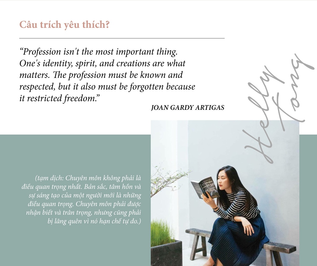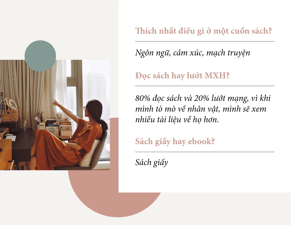 Với Helly Tống, điều làm cô thích nhất ở một cuốn sách là ngôn ngữ, cảm xúc và mạch truyện. 9X cho biết khi tò mò về một nhân vật nào đó, cô sẽ dành nhiều thời gian xem tài liệu về họ.