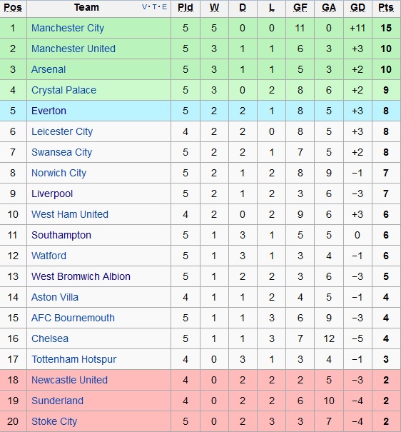 | Bảng xếp hạng Premier League mùa này sau khi kết thúc các trận đấu sớm ở vòng 5. |