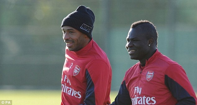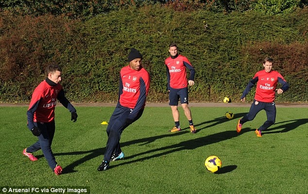 | Cặp tiền vệ tài năng Wilshere và Ramsey háo hức tập luyện bên cạnh huyền thoại Thierry Henry. |