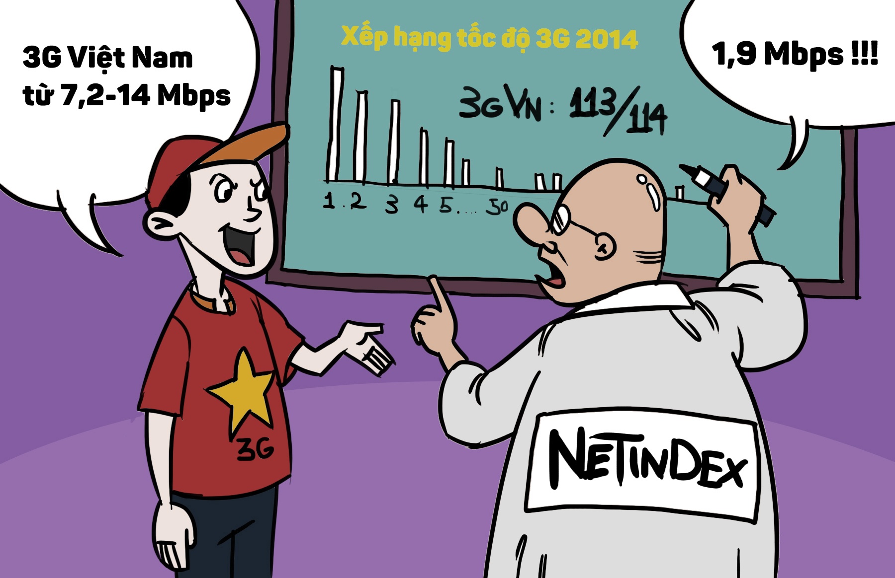 | Nhiều lần bị truy hỏi về tốc độ 3G, các nhà mạng đều có câu trả lời rằng tốc độ truyền dữ liệu ở Việt Nam khá tốt, lên tới 7,2-14 Mbps. Tuy nhiên, theo Netindex, tốc độ 3G tại Việt Nam chỉ khoảng 1,9 Mbps, và đứng thứ 113/114 quốc gia và vùng lãnh thổ được khảo sát trong năm 2014. Trong khi đó, Singapore đứng đầu thế giới với tốc độ lên tới 118 Mbps. |