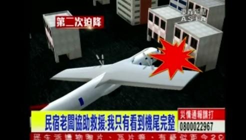 Mô phỏng chiếc máy bay lao xuống khu dân cư ở thị trấn Huhsi. Cú va chạm khiến hai ngôi nhà bị cháy. Hiện chưa rõ số thương vong dưới mặt đất trong vụ tai nạn. Ảnh: TVBS |