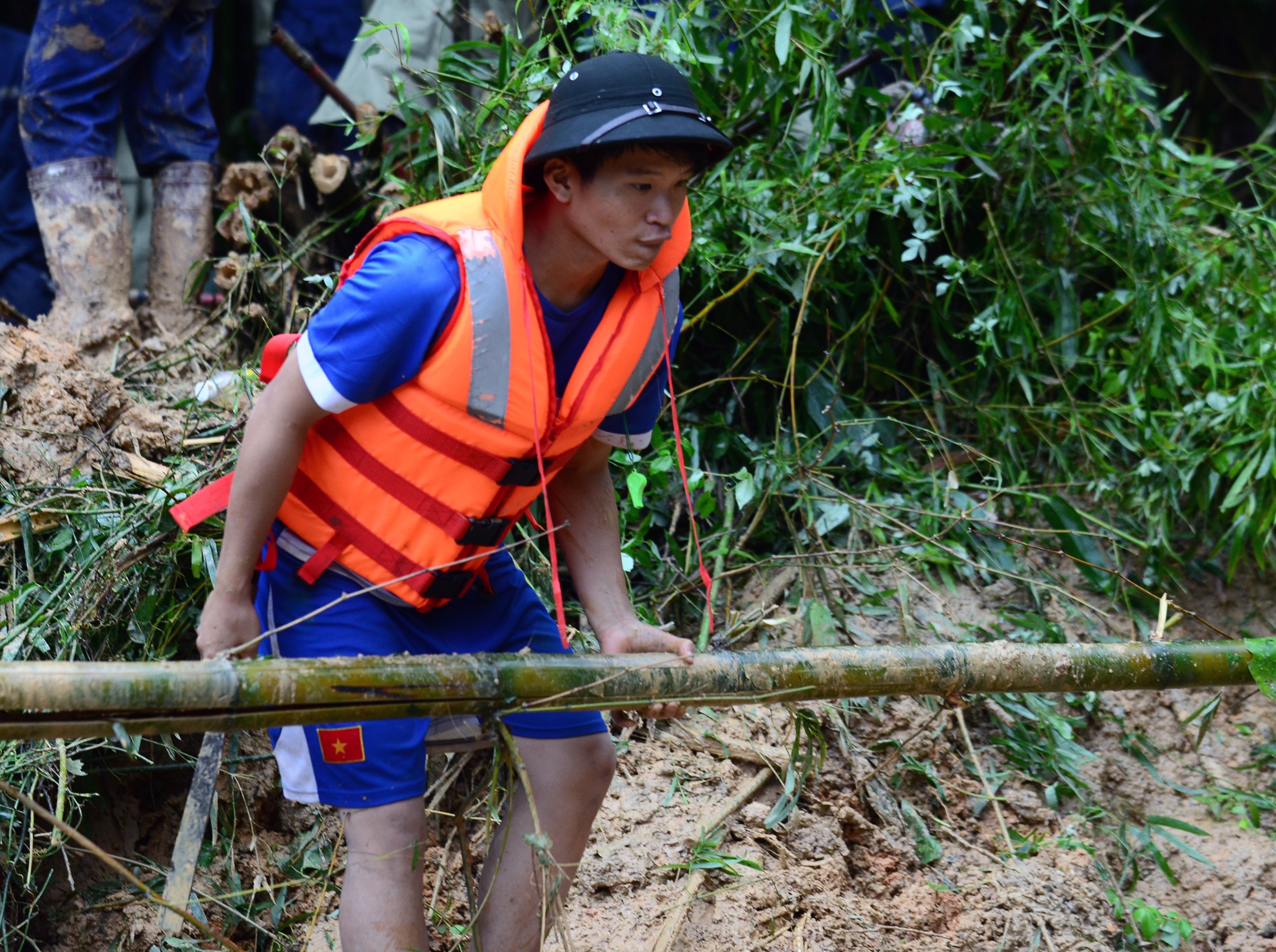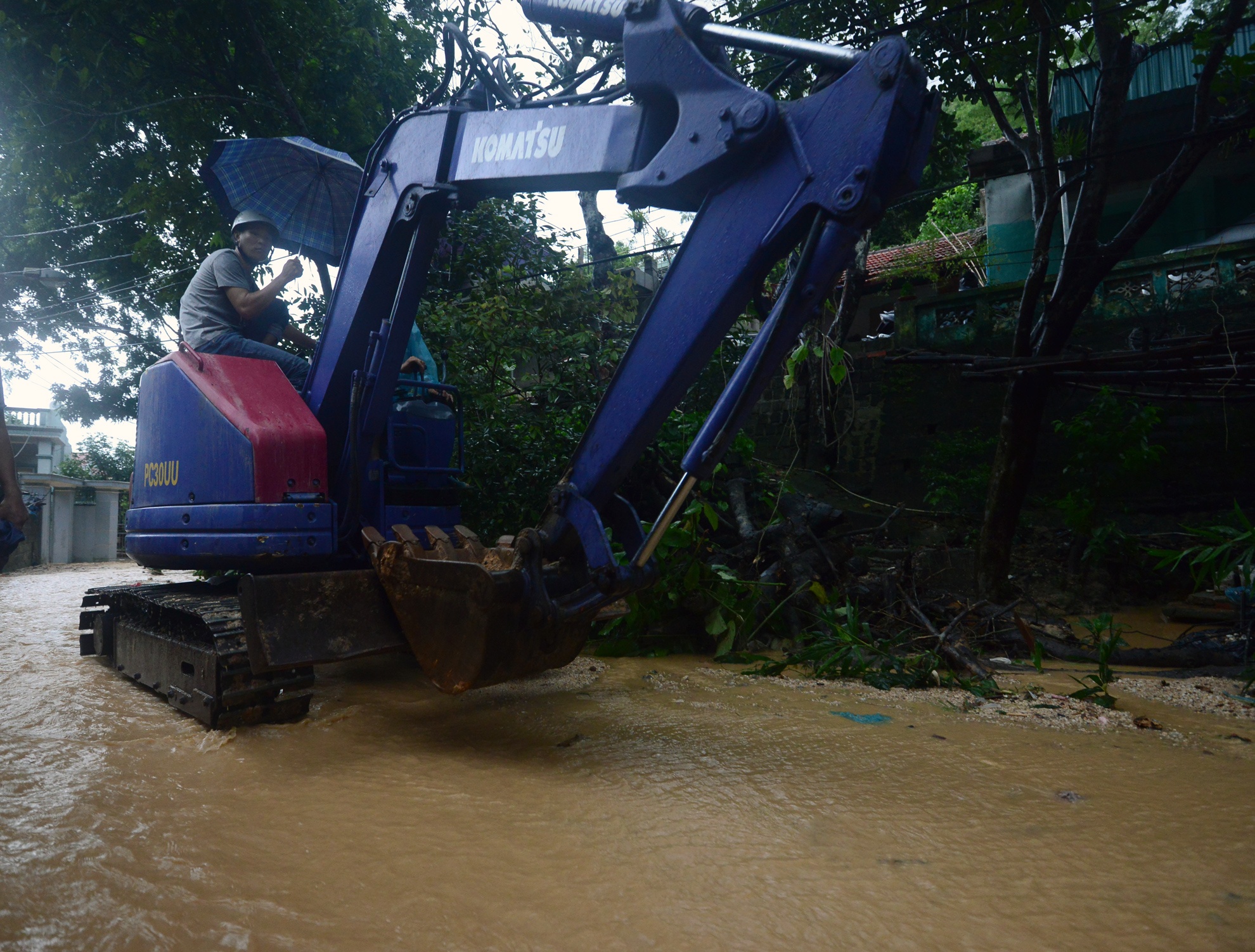 Đường vào hiện trường là ngõ nhỏ, nước đổ từ trên núi xuông xối xả do vậy không thể mang được máy móc thiết bị lớn vào được, chỉ có thể điều động máy xúc nhỏ cơ động để leo lên.