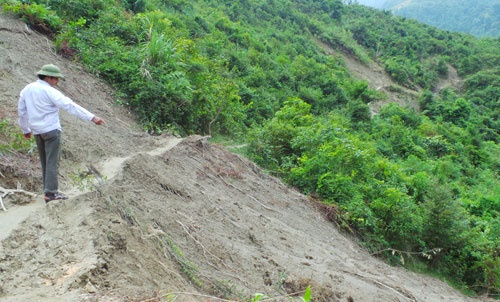 | Người dân chỉ nơi xảy ra vụ sạt lở. |